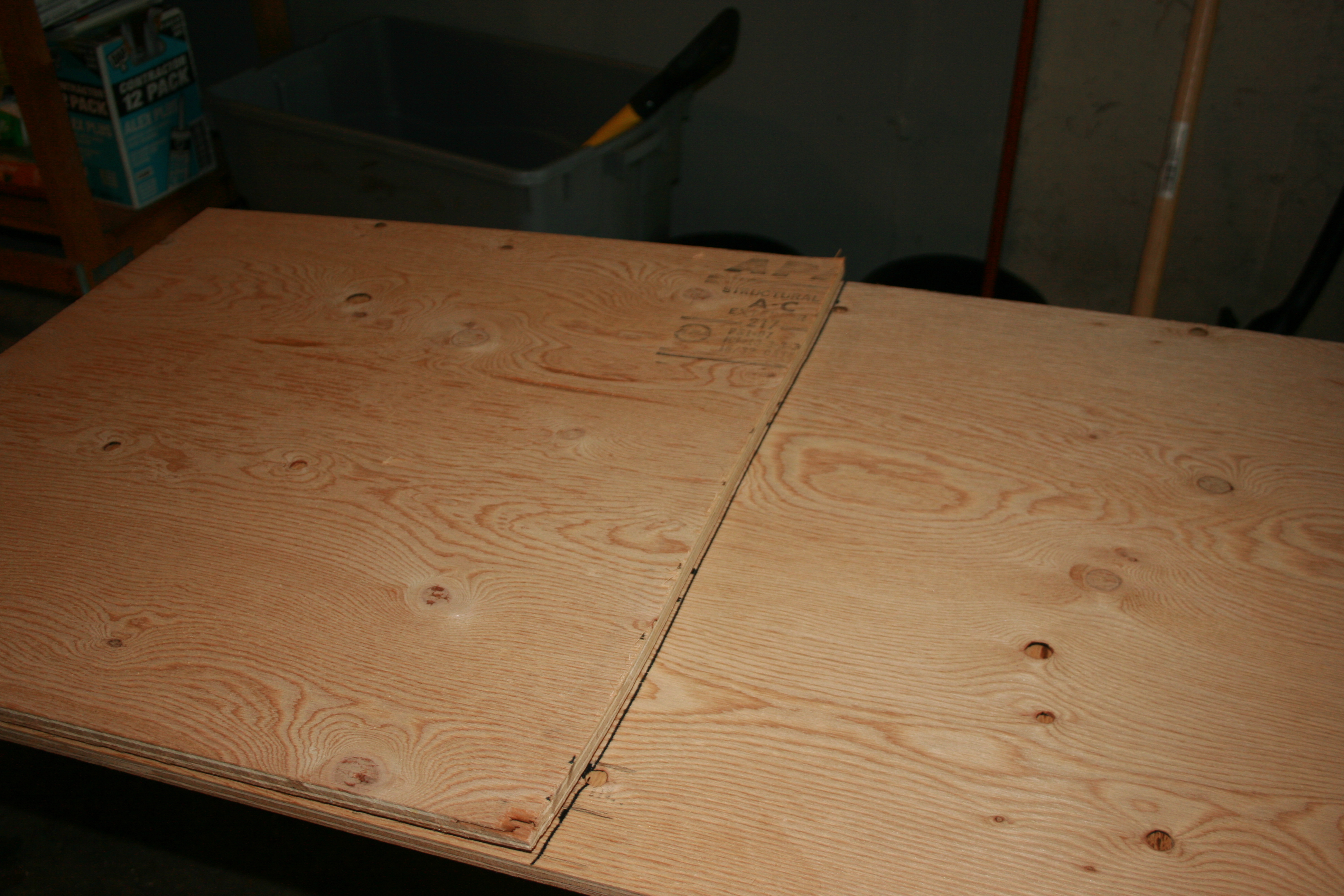 Apparently, plywood doesn’t like to have just a bit sawed off the long edge. It splintered a lot and the saw, which had done an excellent job of following my beautifully straight lines, was not so straight. I directed it outward, figuring it would be easier to get rid of extra material on the edge than to add some back in if I cut too much.