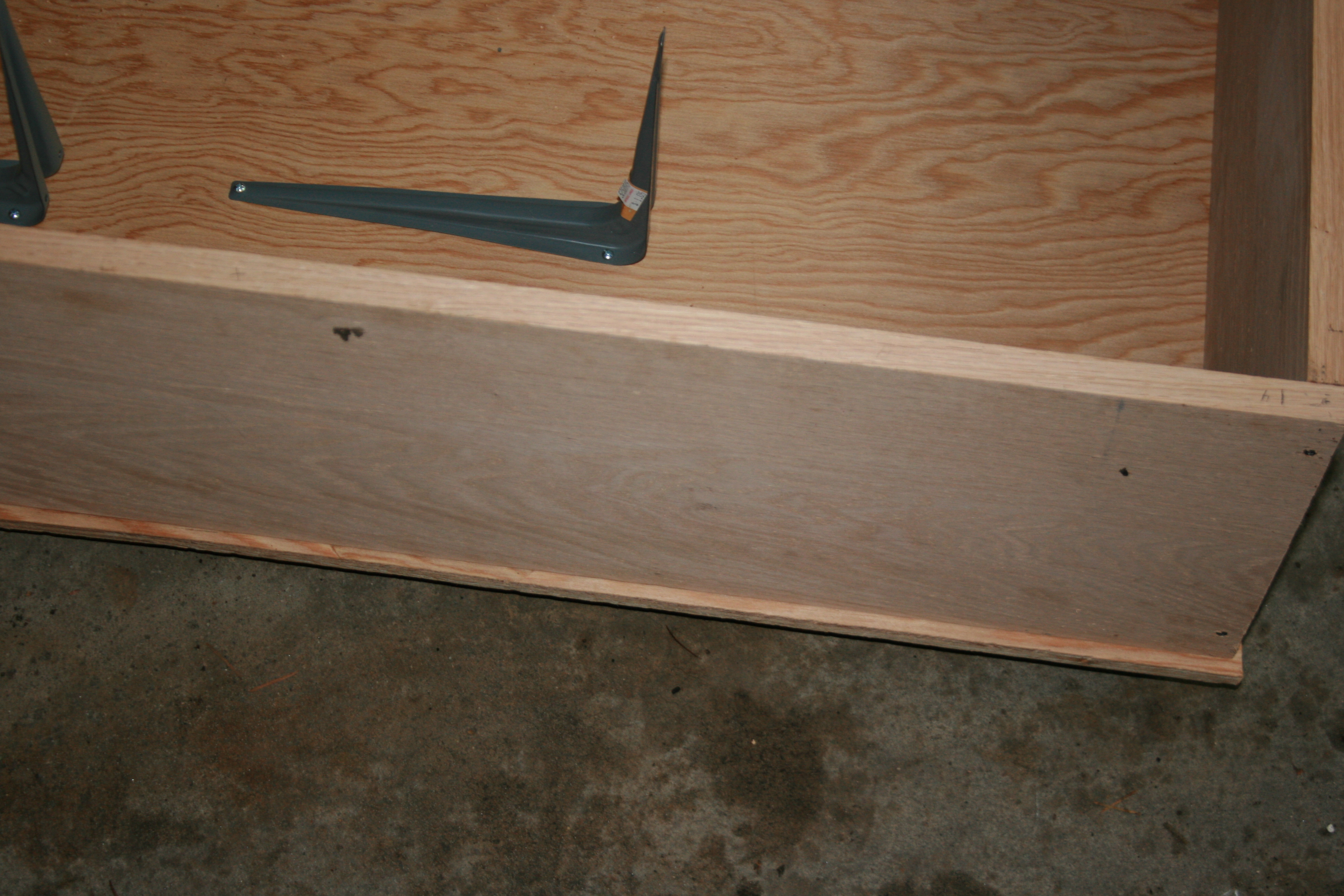 After carefully getting all of the boards to stand on their sides, I determined that the easiest way to fix the problem was to make the shelf slightly narrower and shorted than intended, screwing the top and bottom boards inside the outer boards instead of above and below them. That left me with just over an inch of extra width on the plywood I’d have to take care of. But trimming one piece of plywood gave me much less margin for screw up than trimming all five shelves, or so I thought.