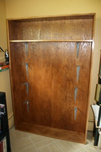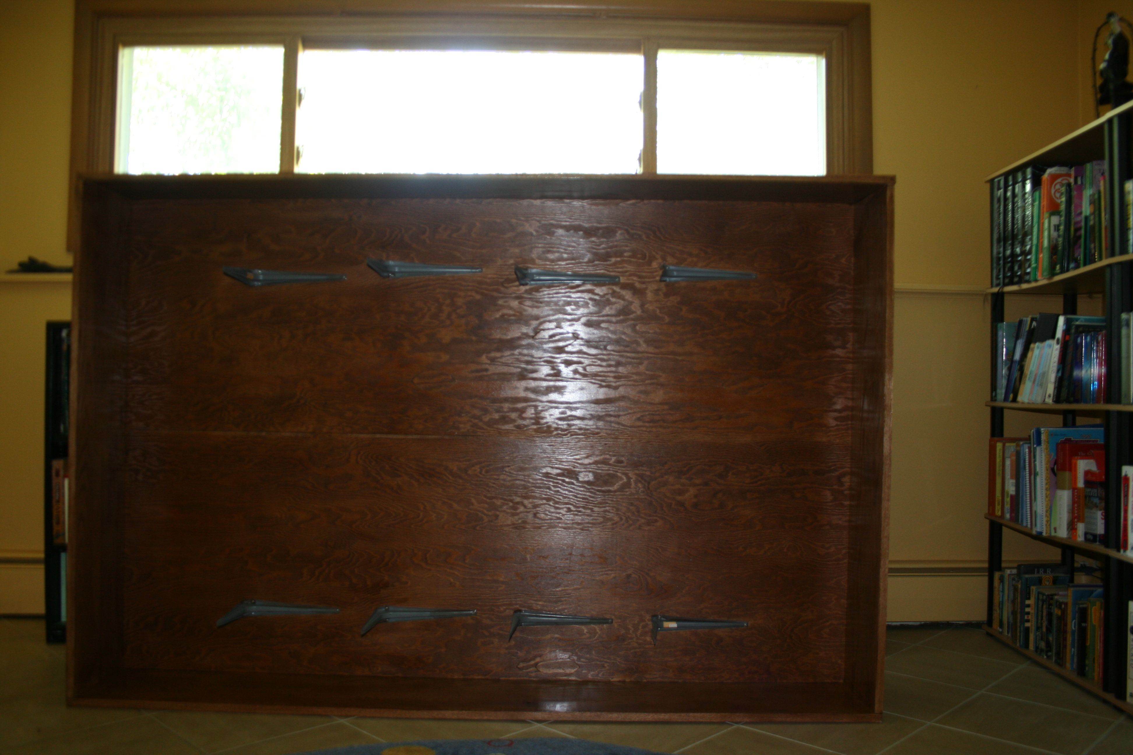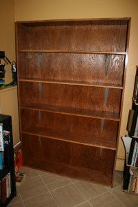 The next day I put the second coat of varnish on the shelves, thereby completing the construction process. Or so I thought. Remember the ominous, foreboding ending on the last post? Yeah, that was done with intent. Two months on its side, in my garage, warped the bookcase just enough that the shelves no longer fit. I needed to saw off about a quarter of an inch, or, you know, slightly less than the overhang on the plywood that caused me to dither and delay in the first place. The universe, it is made of dramatic irony that’s out to get me.