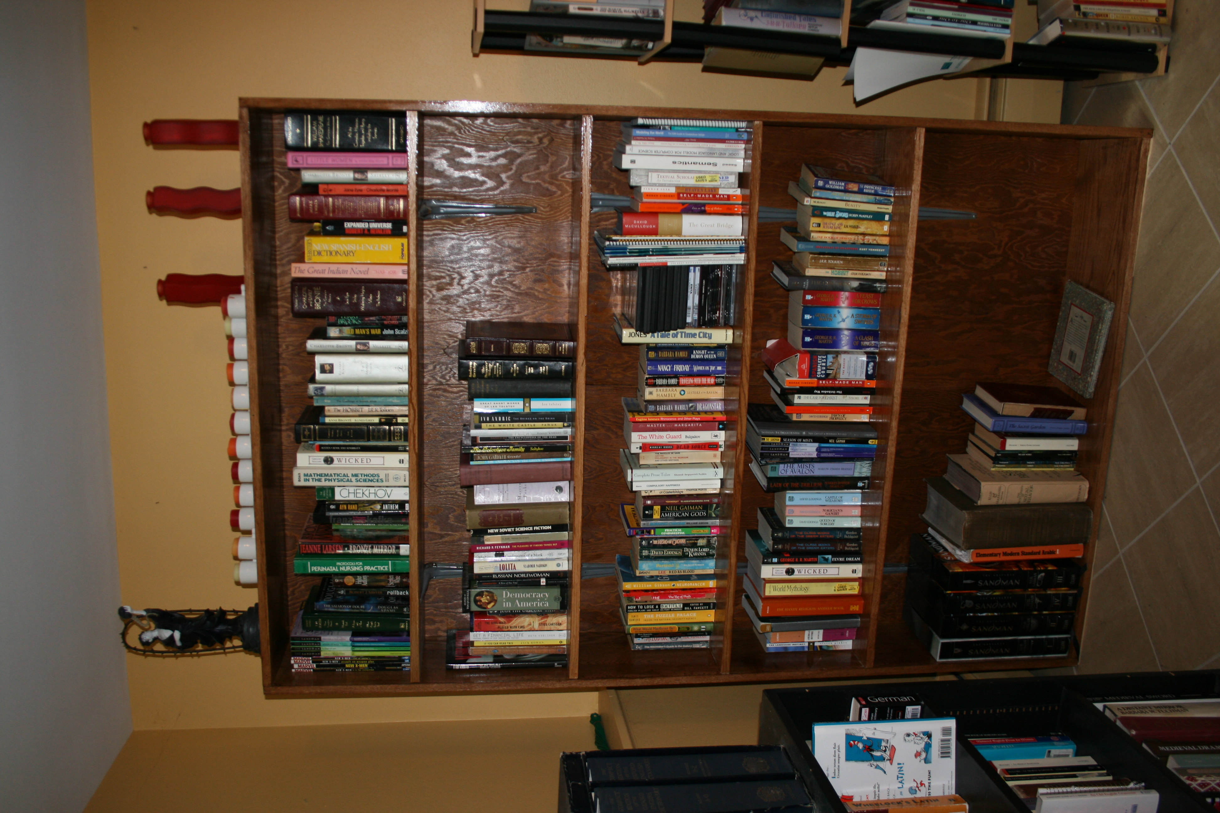 You’ll note how its taking up less floor space than the two bookshelves it’s replacing, yet has room on its shelves after putting all of their books on it. You’ll also note what a remarkably fine looking piece of furniture it is, even if I do say so myself. And I do. Frequently. The roomies are probably tired of hearing it. Or disturbed by the increasing quantity of furniture I’m prone to pet and congratulate. It’s hard to be a crass materialist and look sane at the same time.