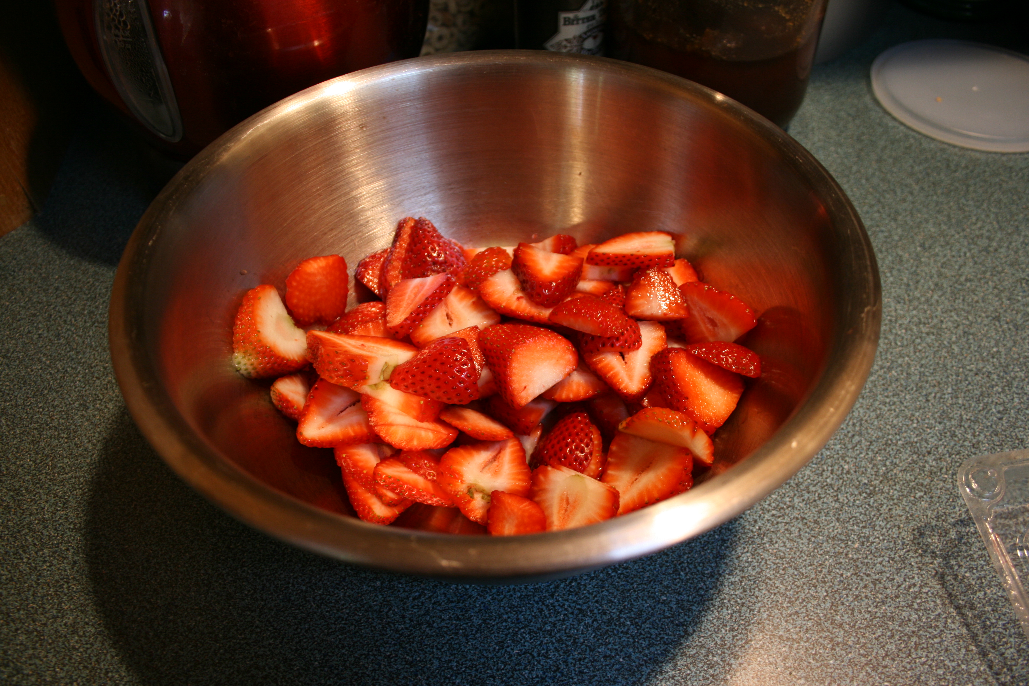 This recipe starts, like many of my favorite desserts, with chopping up a bunch of strawberries.
