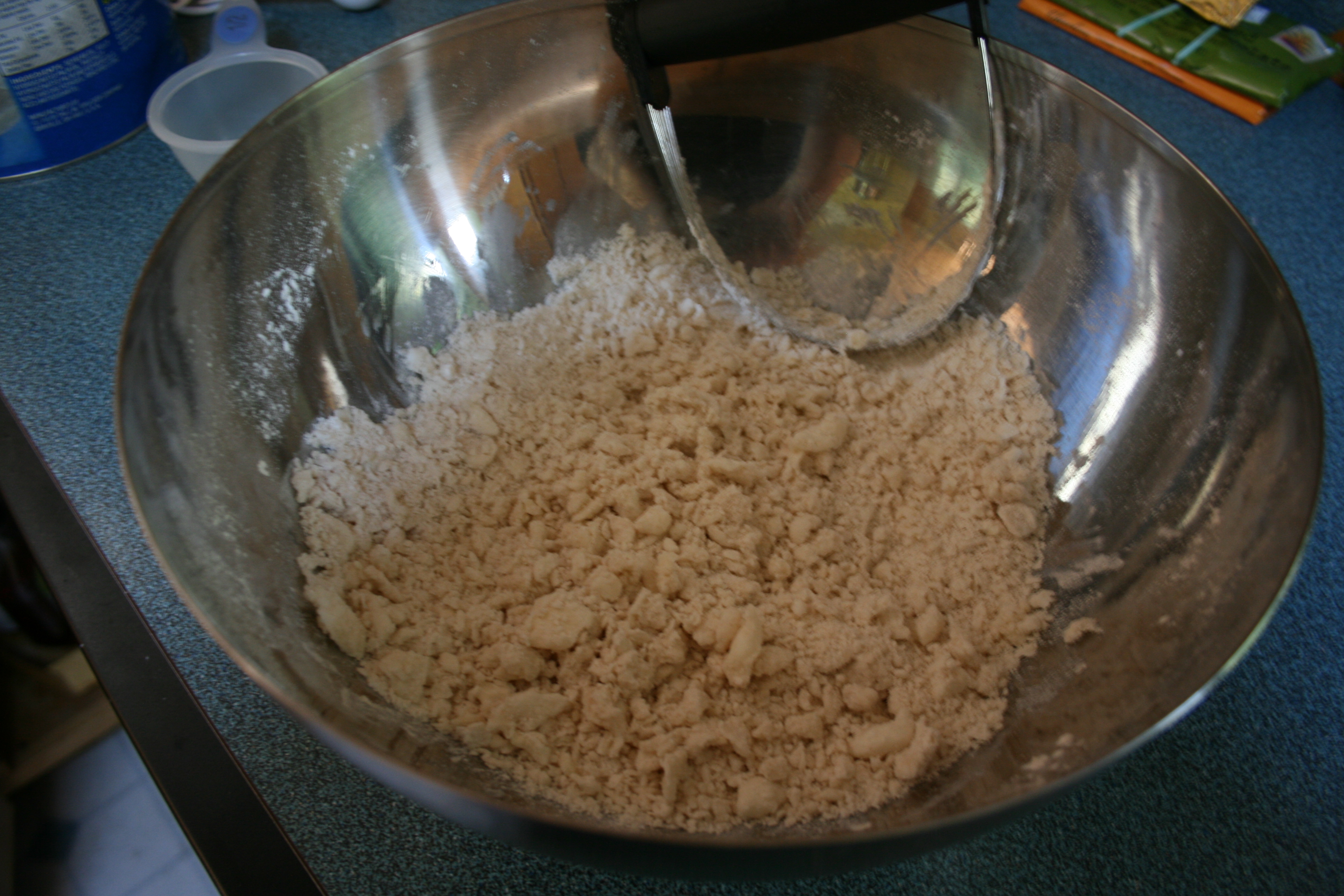 The biggest thing to keep in mind with pie crust dough as that this is not bread dough. You do want the butter cold. You do not want to knead. It gets flaky and good precisely because the ingredients are uniformly distributed. So when the recipe says to cut the fats into the dry ingredients until you have a texture like coarse sand, what they mean is that it should look like this: