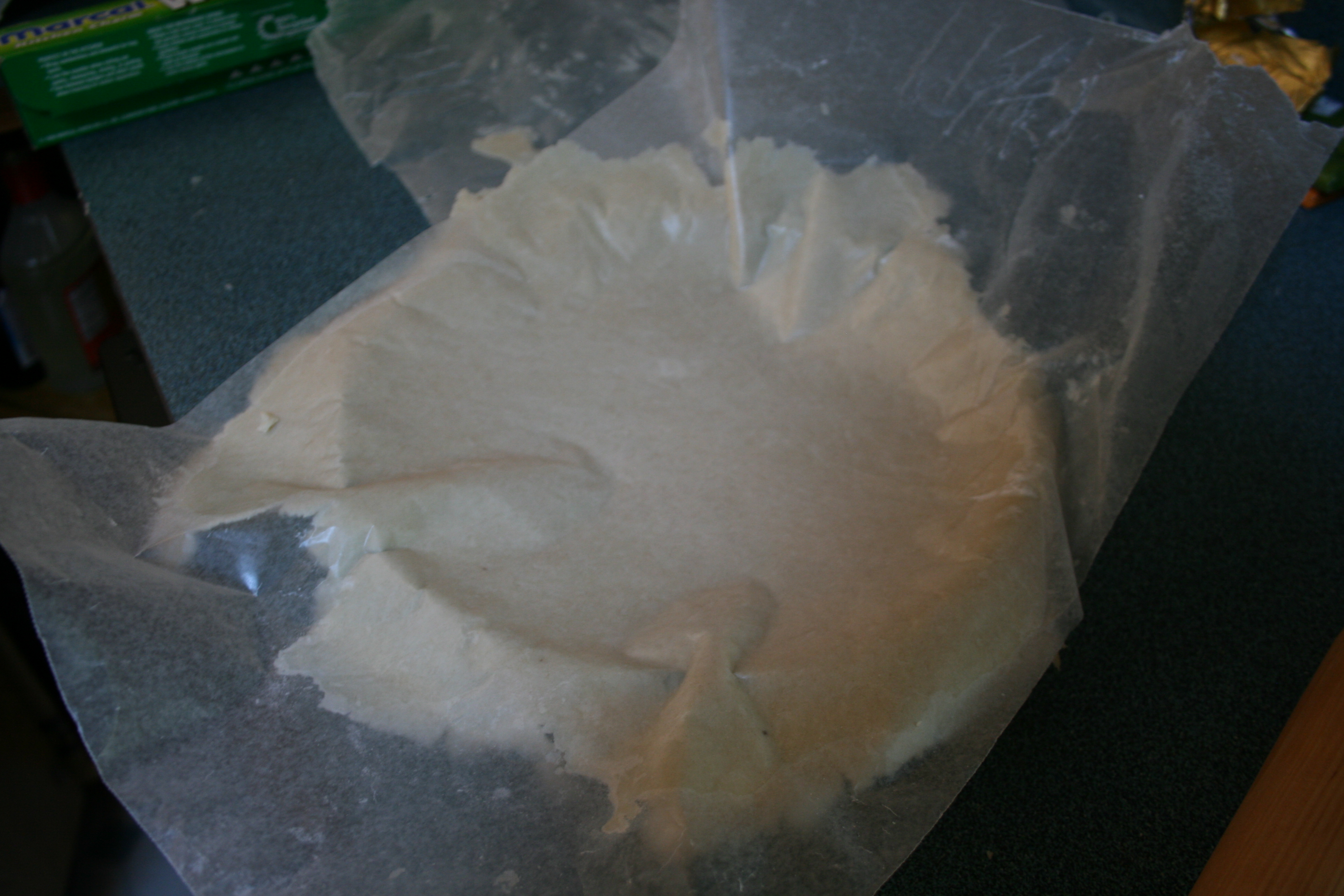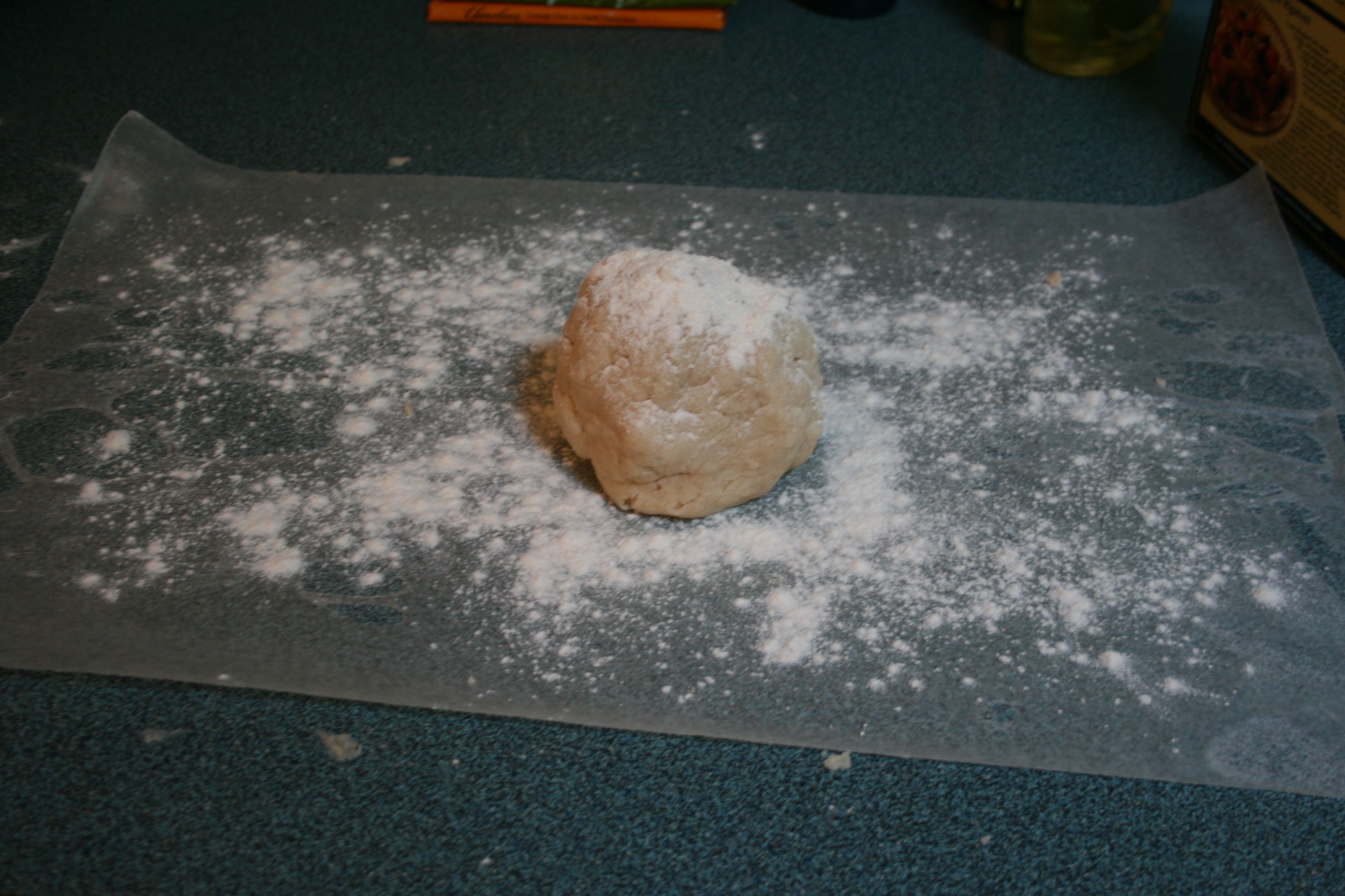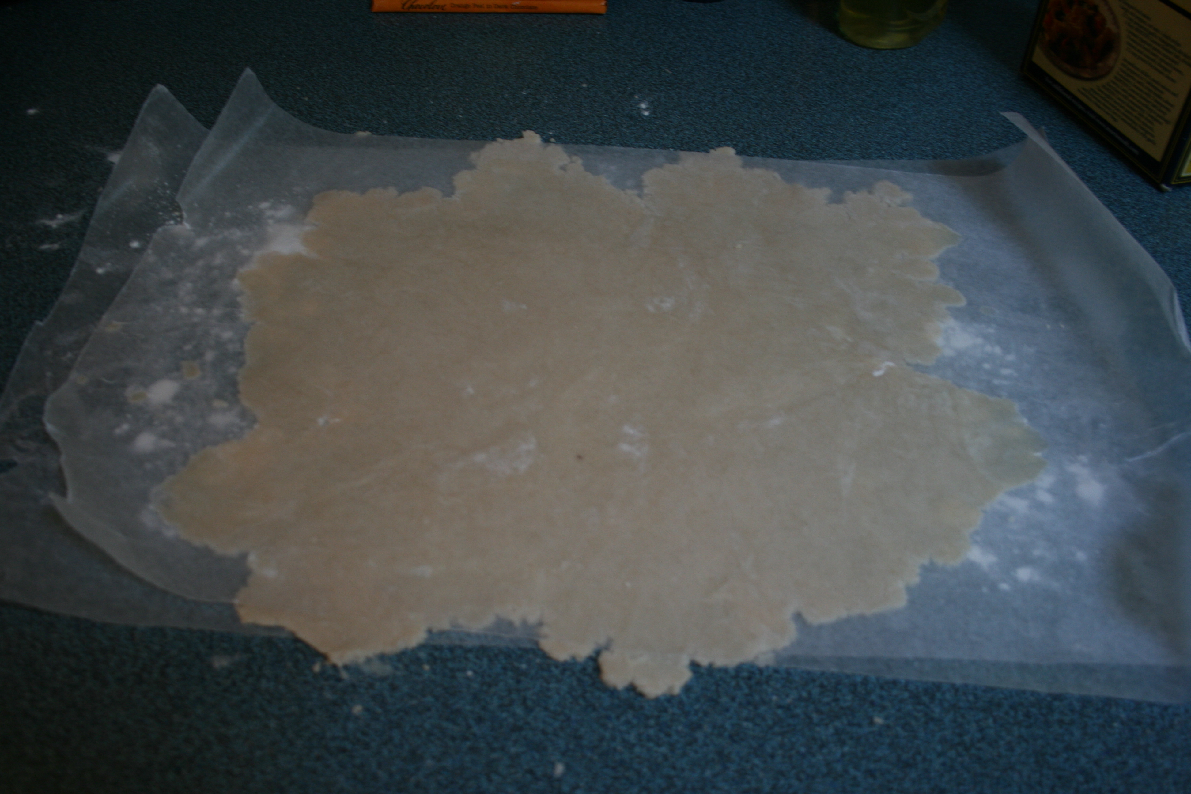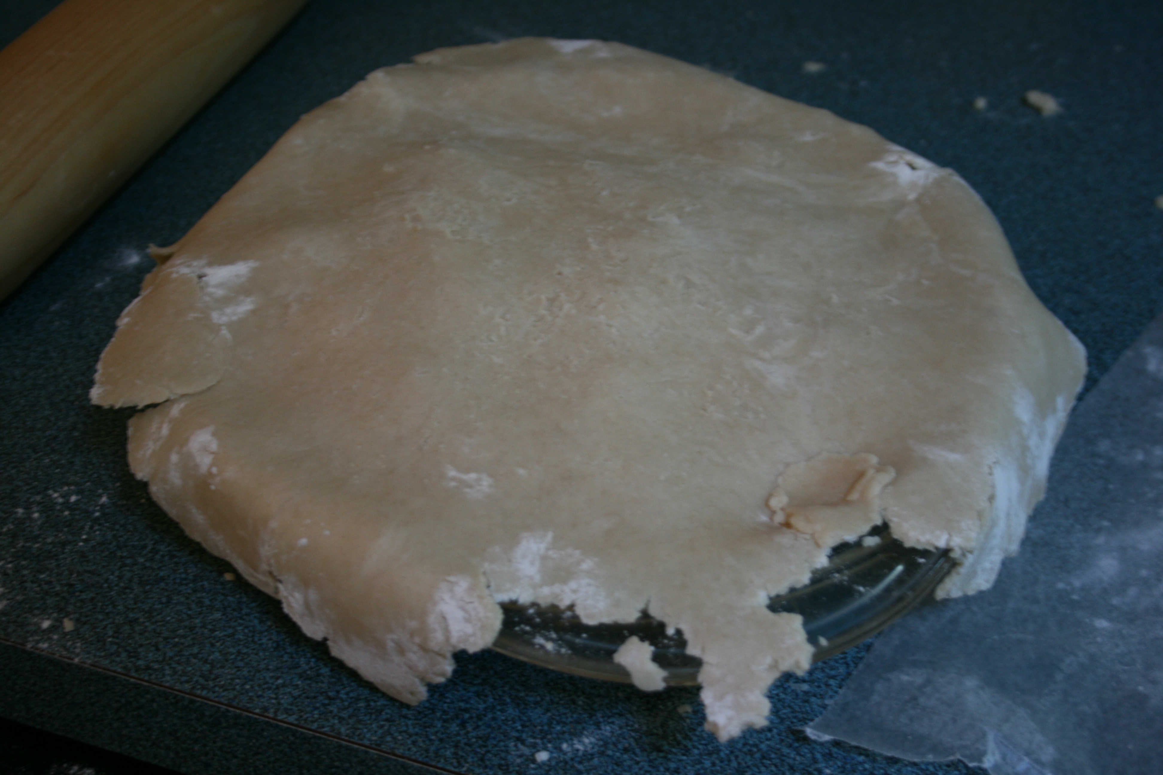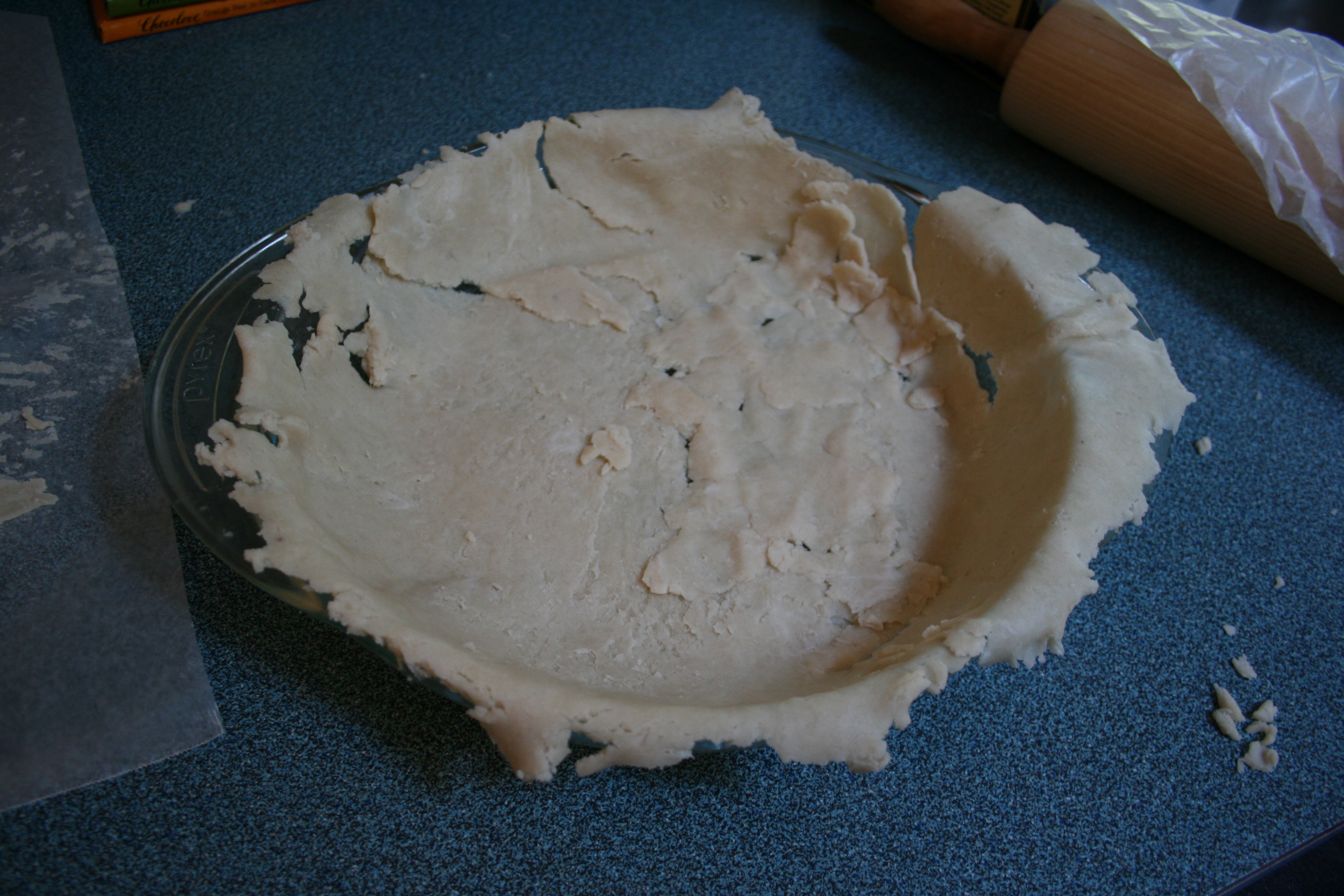 You put another sheet of wax paper on top of the dough, then roll it out between the two sheets. Dough does not stick to your counter, or your rolling pin. This gives you more wiggle room for mistakes with over-watering your dough, not to mention making cleanup easier. It also makes the counter-to-pie-plate transition much, much simpler. Like so: