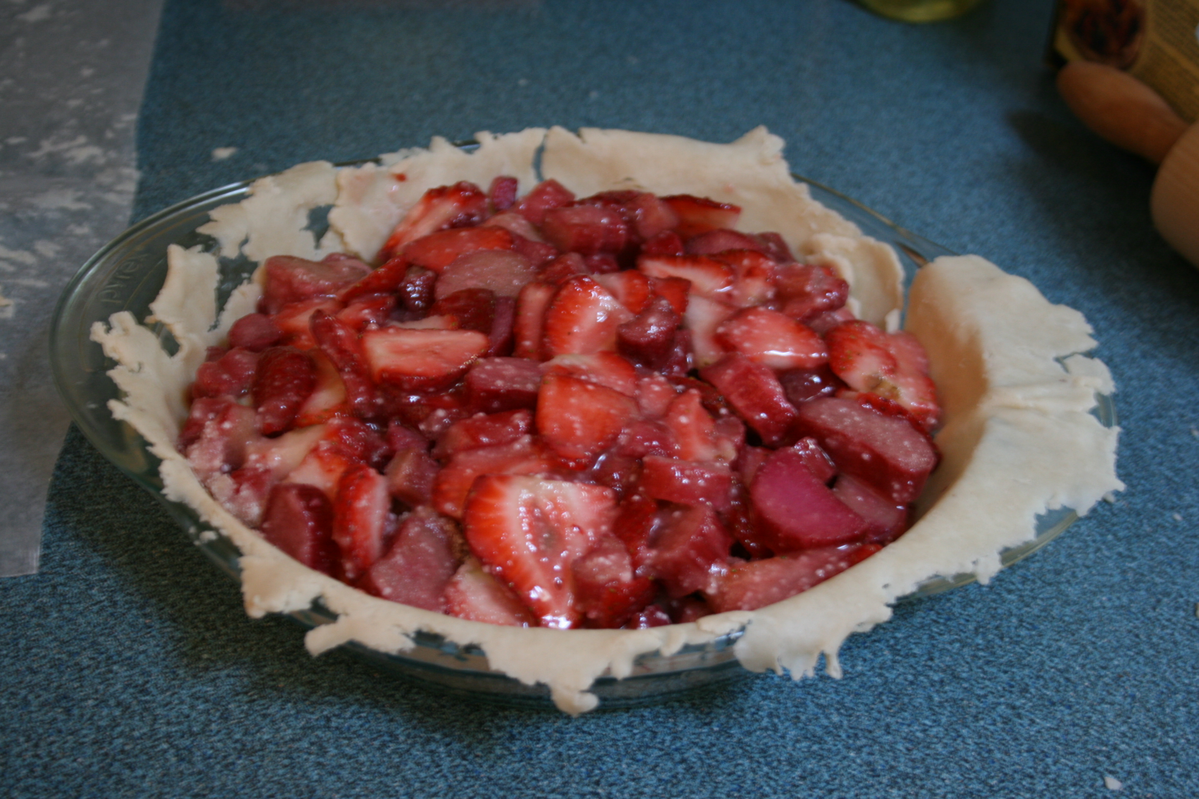 Sylvia won for being the closest to guess my first partial request date. Her requested prize was that I design a pie for her. This, I think, turned out harder than just making her a pie, because I stressed a lot over making sure I had a recipe that would be good enough to be equivalent to somebody else making her a pie. Ultimately, I opted for what is probably by far the most popular pie recipe I make: Strawberry Rhubarb.