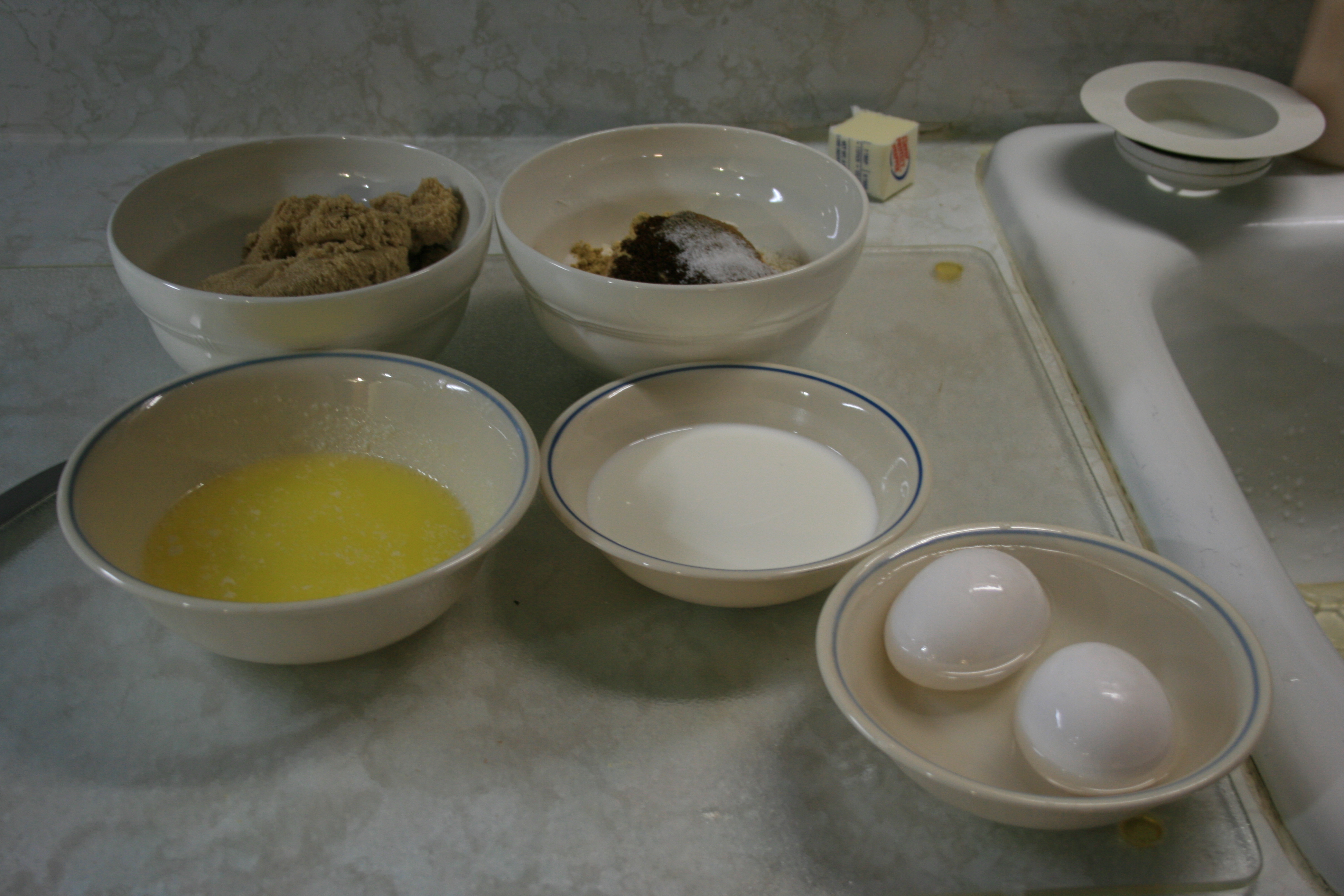 I gathered all of the ingredients and portioned them ahead of time. This was in part to make sure I didn’t go scrambling for something only to fail at finding it during a critical juncture, but also to make sure I had what I needed, and that it was actually what I wanted and not some obscene pretender. This is a kitchen where the first two things of salt I grabbed proudly proclaimed that they contained no salt. Apparently imitation salt is a thing? I was disturbed, and horrified, and then organized all of my ingredients ahead of time. (The yellow bowl is melted butter, not oil. The eggs are in water to warm them up to room temperature.)