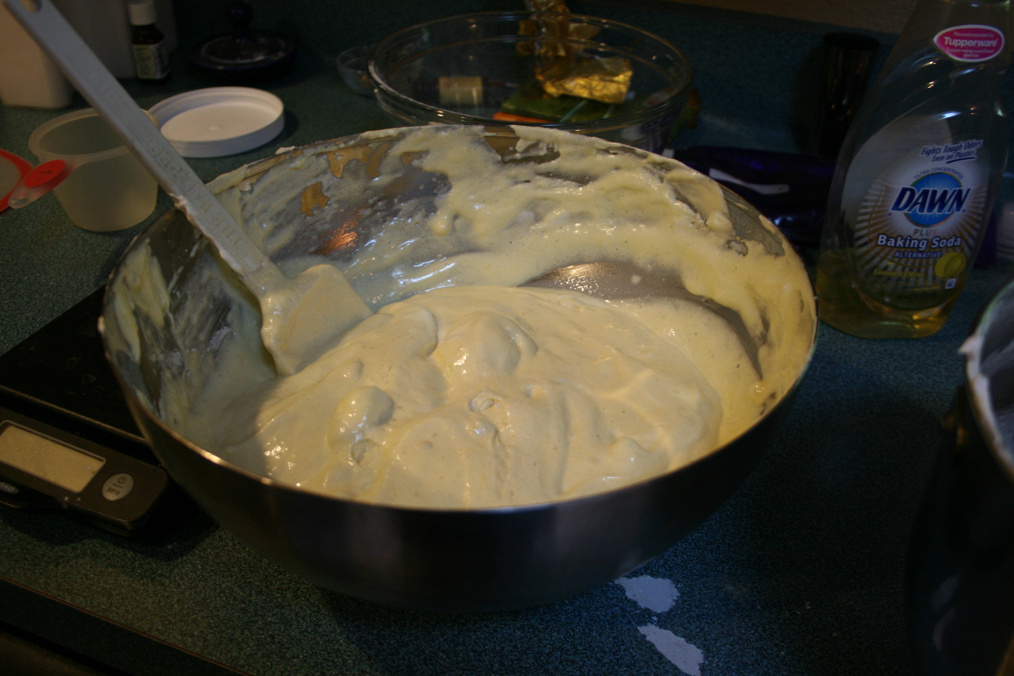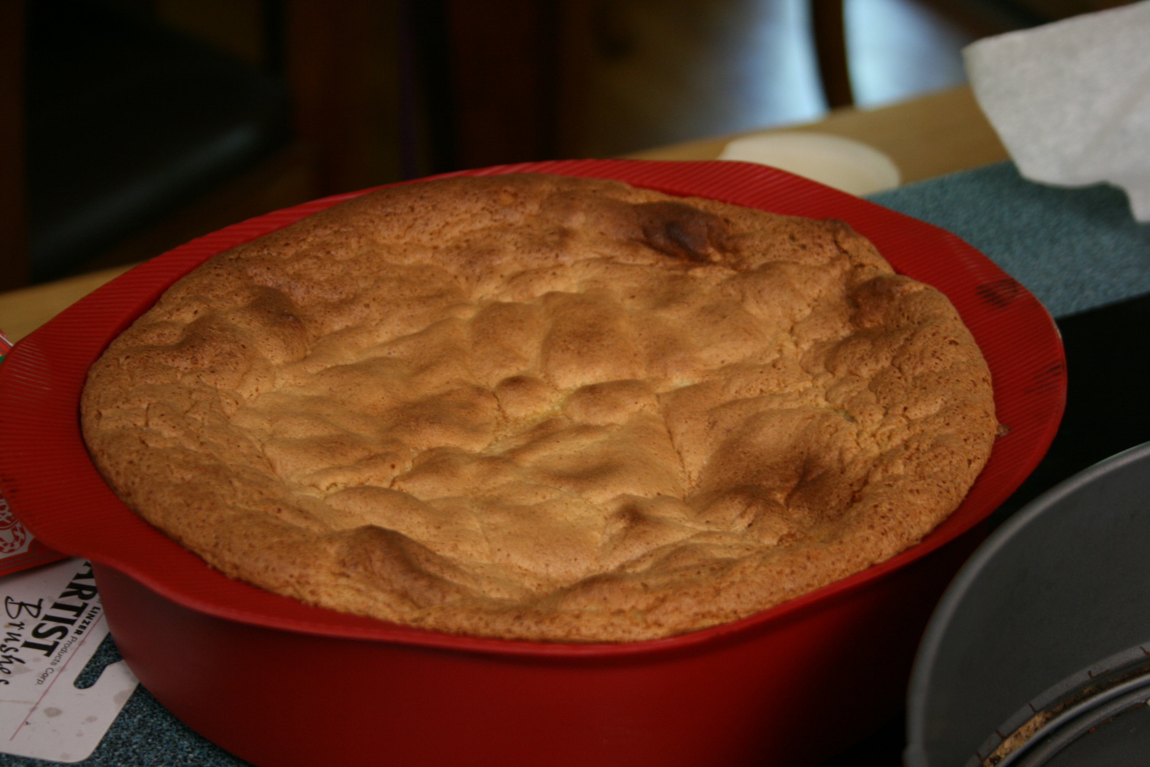 I’m a reasonably intelligent individual and by now I’ve figured out that most recipes in this book take more than a single day to make if I want to get anything else done that day. So I decide that on Friday I’ll do the actual sponge cake making bit, then designate Saturday as the day everything gets assembled and the cake actually gets served. That means making custard, poaching fruit, and whipping cream for frosting; it shouldn’t be all that hard. So, Friday afternoon I set to work. I’ve got a date with a buddy and an Agricola board scheduled for six, but that’s three hours away. I should be golden.