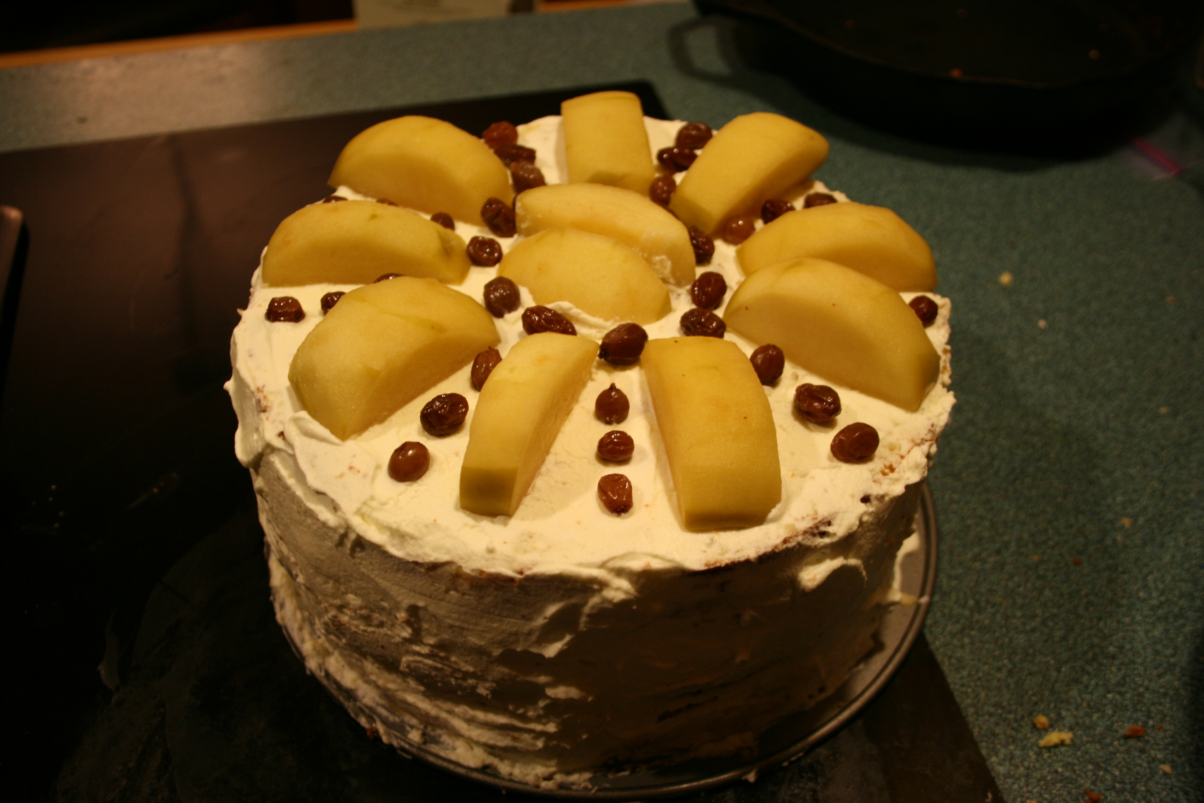 Yeah, I went back and made more. I should have made even more, but I was crabby. Crumbs happened. Up close, the final cake was not very pretty, even after I arranged the apples and raisins. From a distance, and on camera though?