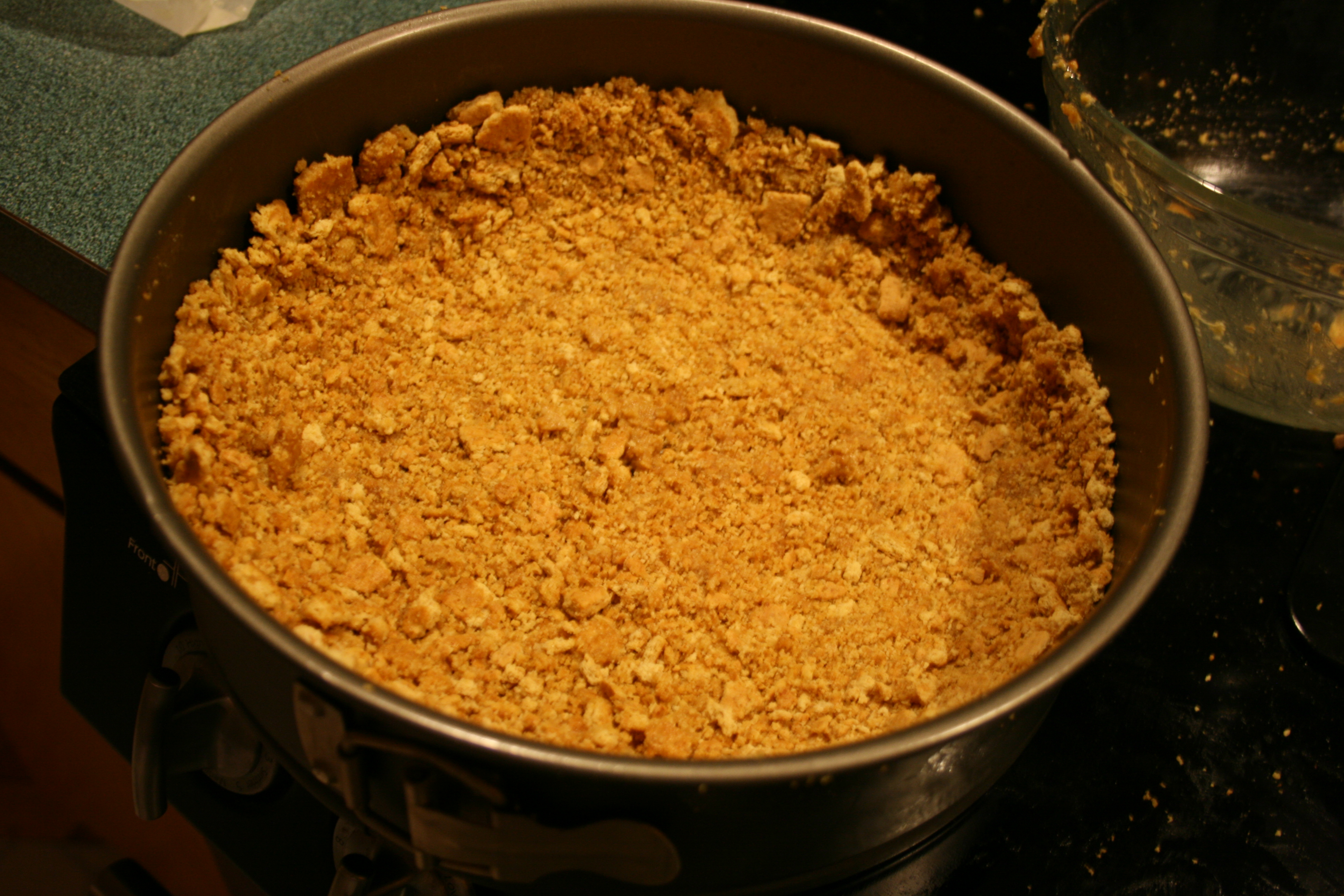It’s possible that part of the reason I like making cheesecake is that you start by crushing graham cracker souls. You smash them beneath your mighty fist, breaking them down until they accept your will as their own, before drowning them in boiling oil melted butter and shaping them according to your own vision. Seriously, cooking is awesome.