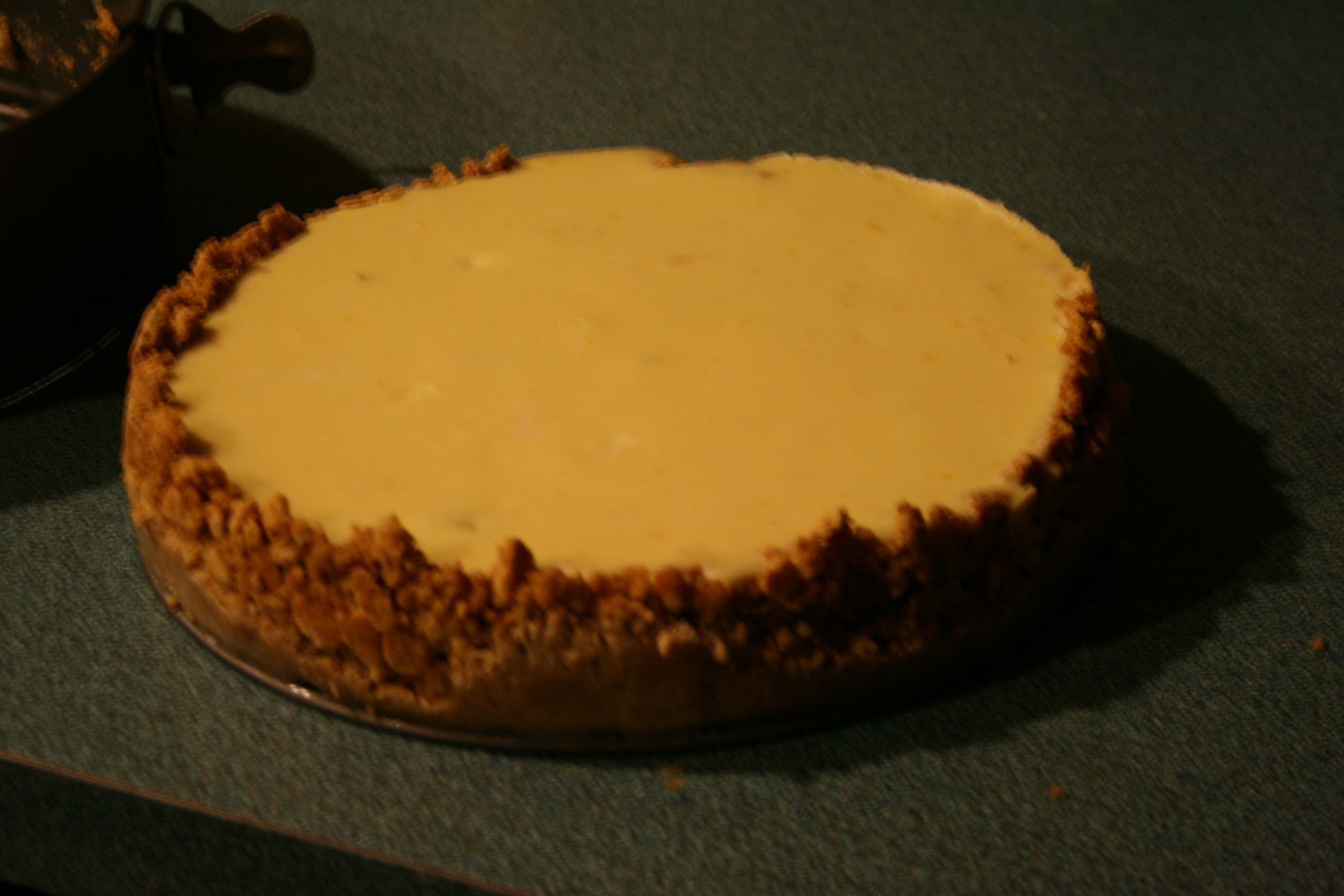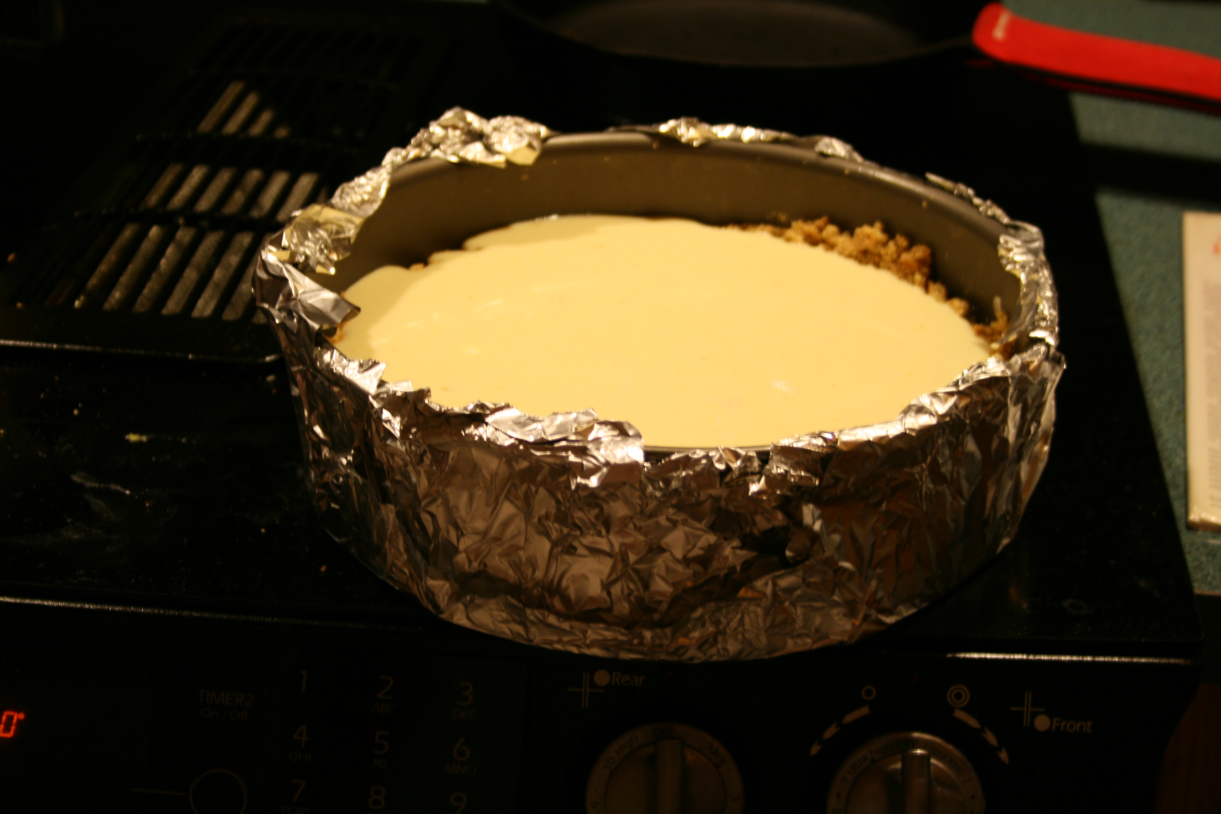 Cheesecake, for all that it’s a rich dessert with a billion froofy variations, is actually really simple to make. If you’ve got a good recipe, it’s just a matter of making sure all your ingredients are at room temperature and letting your mixer do the work. If you’re being efficient, you can make the crust while the mixer works. I wasn’t efficient, because that left me more time to bounce around the kitchen like an idiot while the cake batter mixed. “Somebody told me that you had a boyfriend who looked like a girlfriend…”