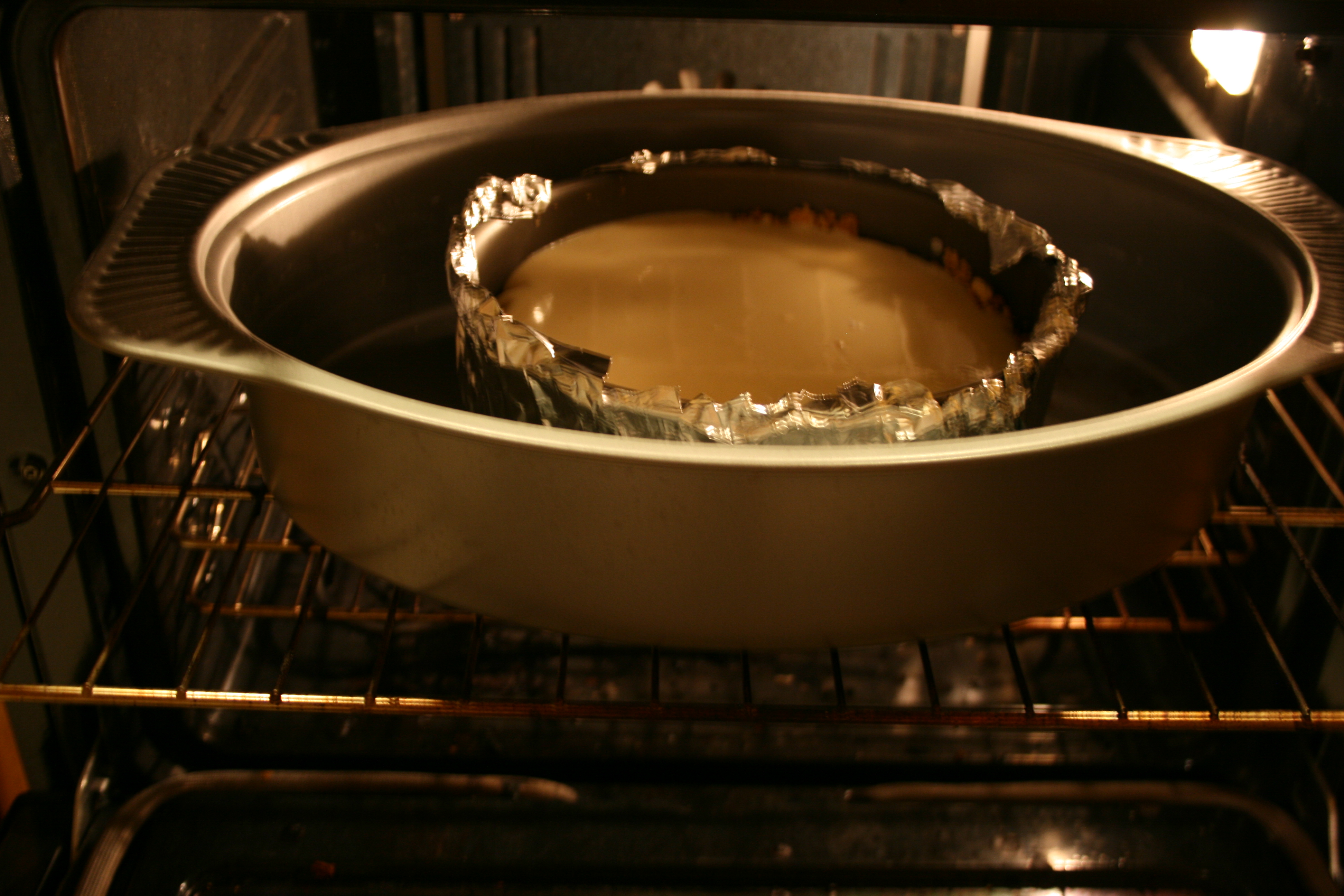 Slide the rack back into the oven, close the door and DO NOT TOUCH. That oven should not open again for at least half an hour. The water will make sure the cheesecake heats evenly, and it’ll help the oven hold its temperature, but there’s no reason to handicap your oven – it has to do all the hard work of making sure you don’t wind up with a dry and or cracked cheesecake. Frolic around the house to inexplicably catchy pop music instead.