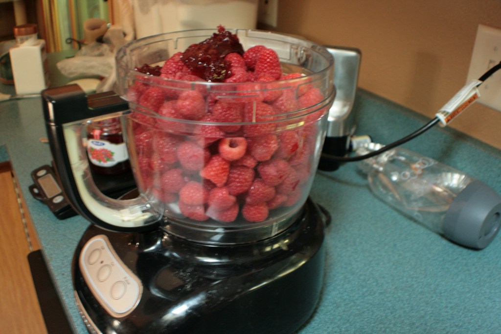 The first step was to make a Melba sauce. This was really where most of my frustration with the recipe stems from. It starts off simple enough. Take a ton of raspberries and puree them with some red currant jelly. (My jelly collection after cooking with this book is becoming truly frightening. I should make more biscuits)