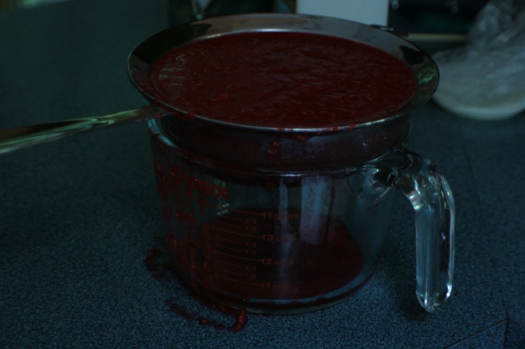 Yeah, it wasn’t going through the sieve. At all. Even with stirring. Vigorously. Threats, insults, imprecations, pleading, bribes, and offers of sacrifice were equally useless. “I’d never work this hard just to make dessert,” Nannie says as she watches me from the dining room. No sane person would.