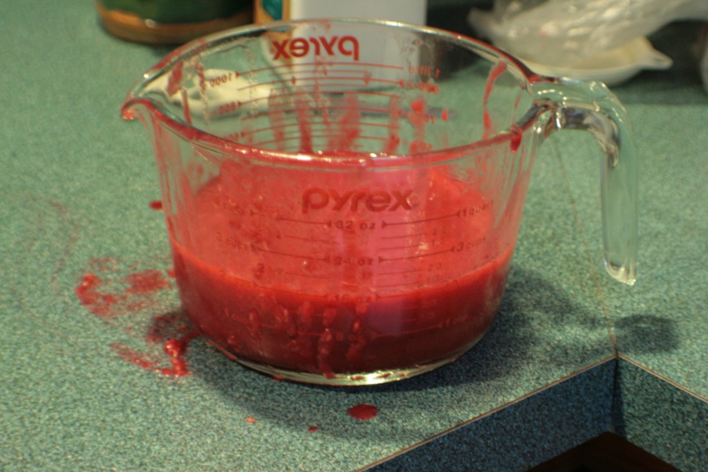 After more time than I care to admit going to work with the sifter, I had two cups of raspberry juice and a ton of raspberry goo. There was definitely more juice to be gotten but you know what? My hands hurt. And I’d already been at this long enough that everybody was going to be in bed before the puddings were ready. Also, the kitchen looked like it had lost a gruesome battle with a Barbie doll. Embarrassing.