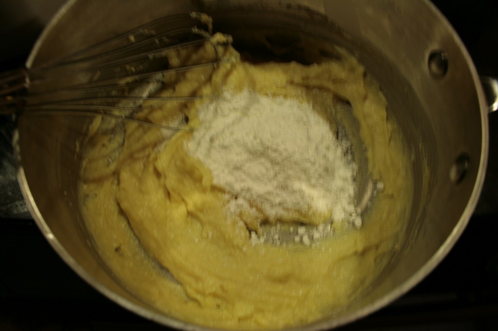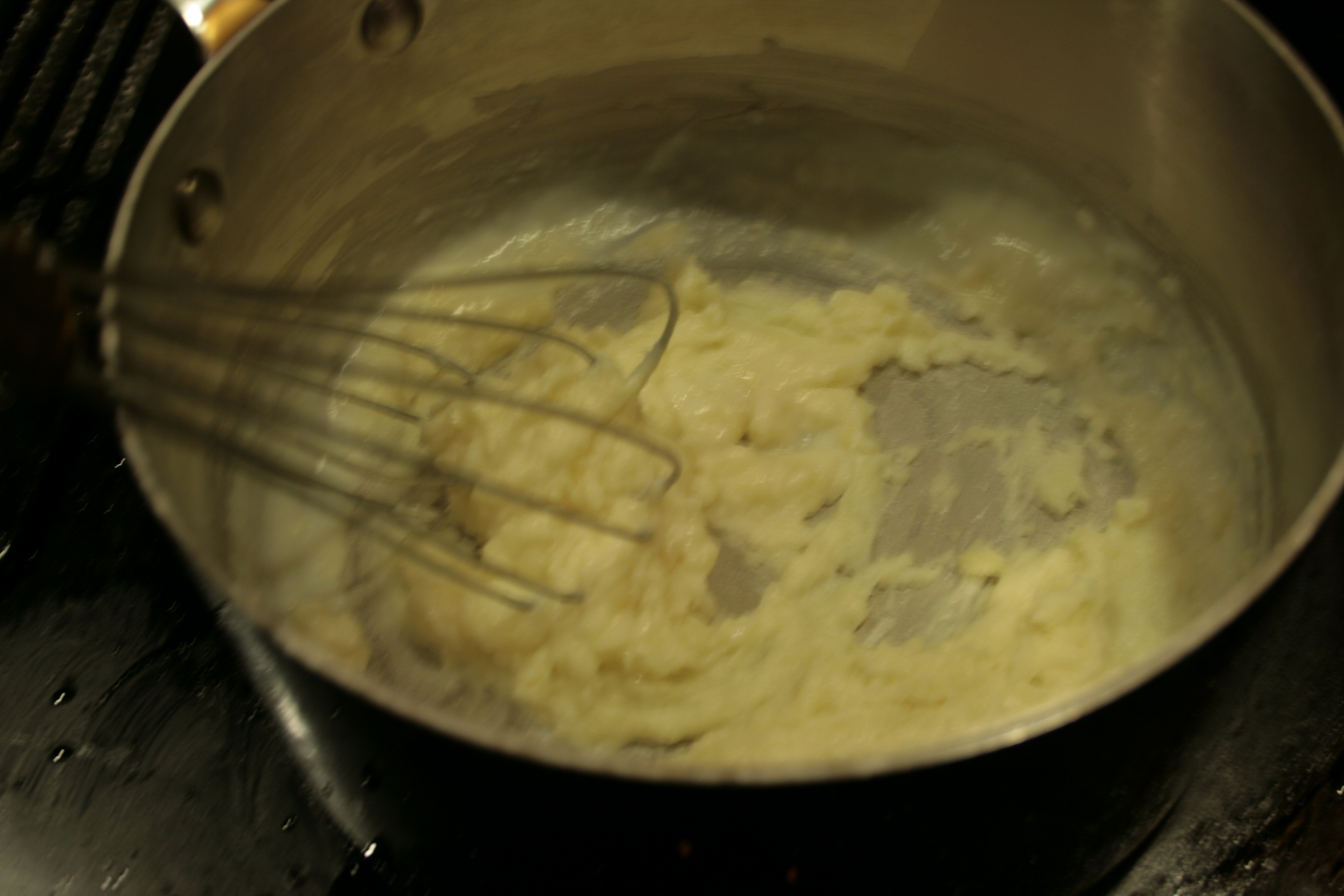 There were basically two phases to making the souffle: The early prep and the final assembly. The early prep involved mushing butter and flour into a paste, mixing some sugar and corn starch, and then throwing all of these together with some scalded milk, egg yolk, vanilla and liqueur to form a custard.