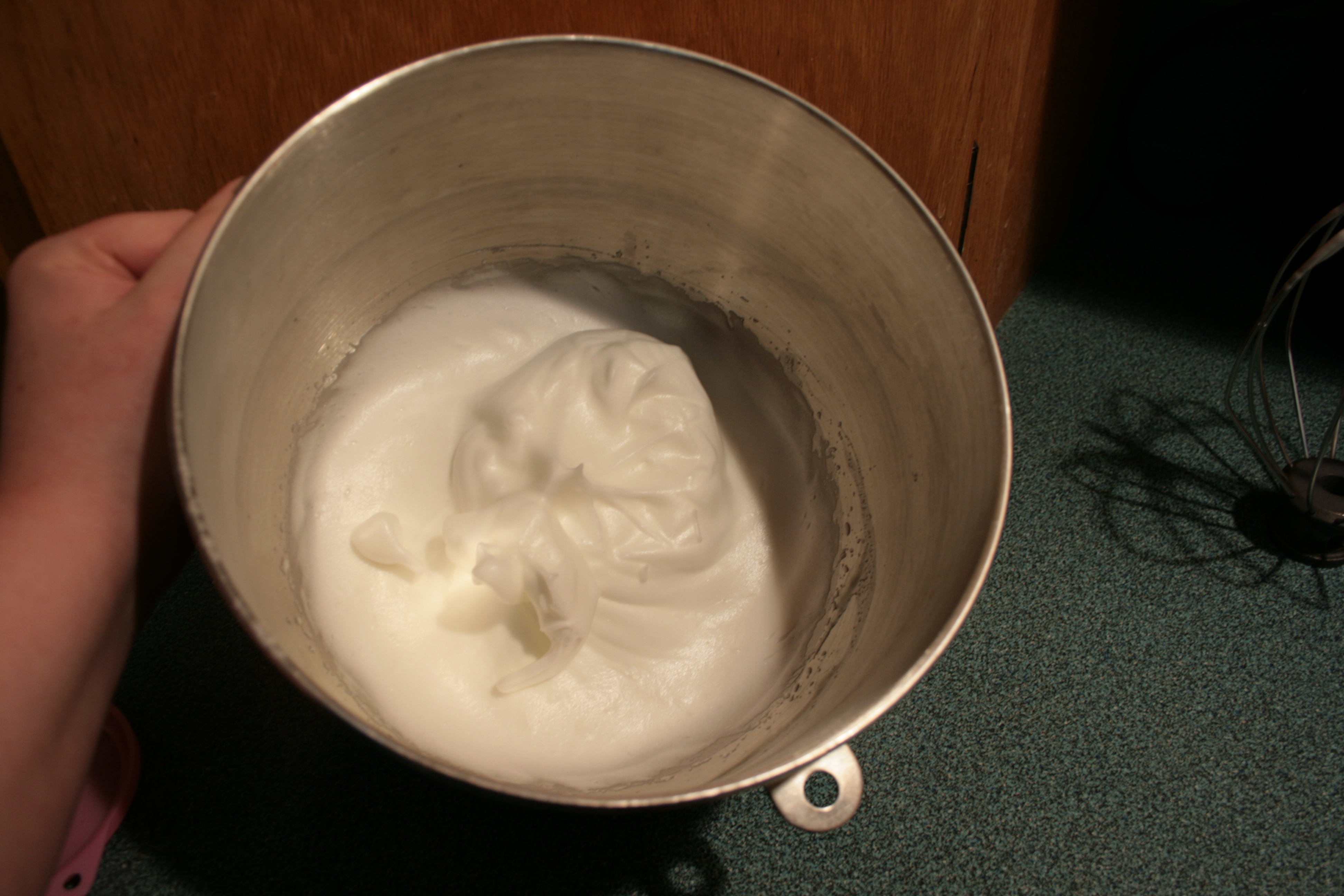 This was really straight-forward. Whip eggs to soft peaks, add sugar, whip to stiff peaks. You’re going to be seeing a lot more of this because September’s chapter is meringue, and what you’re doing here is making meringue.