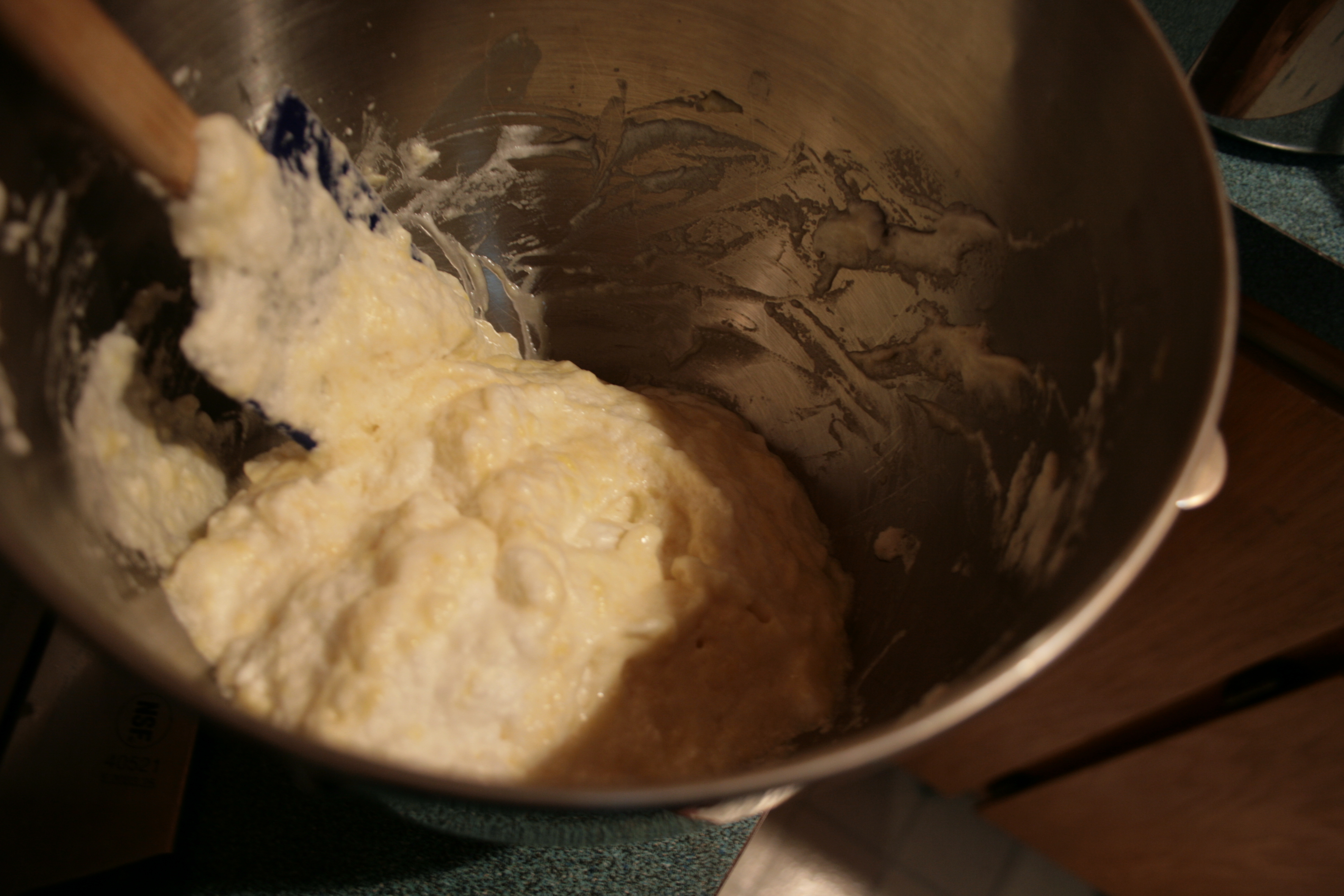 That’s what I got when the butter paste incorporated with the milk. Now it’s paste! I double-checked the recipe to make sure I hadn’t shorted the milk. Nope, 3/4 of a cup is what it called for, and that’s what I used. No biggie, says I. The next several things I add are all liquid. That’ll turn this back into something resembling what the recipe seems to expect.