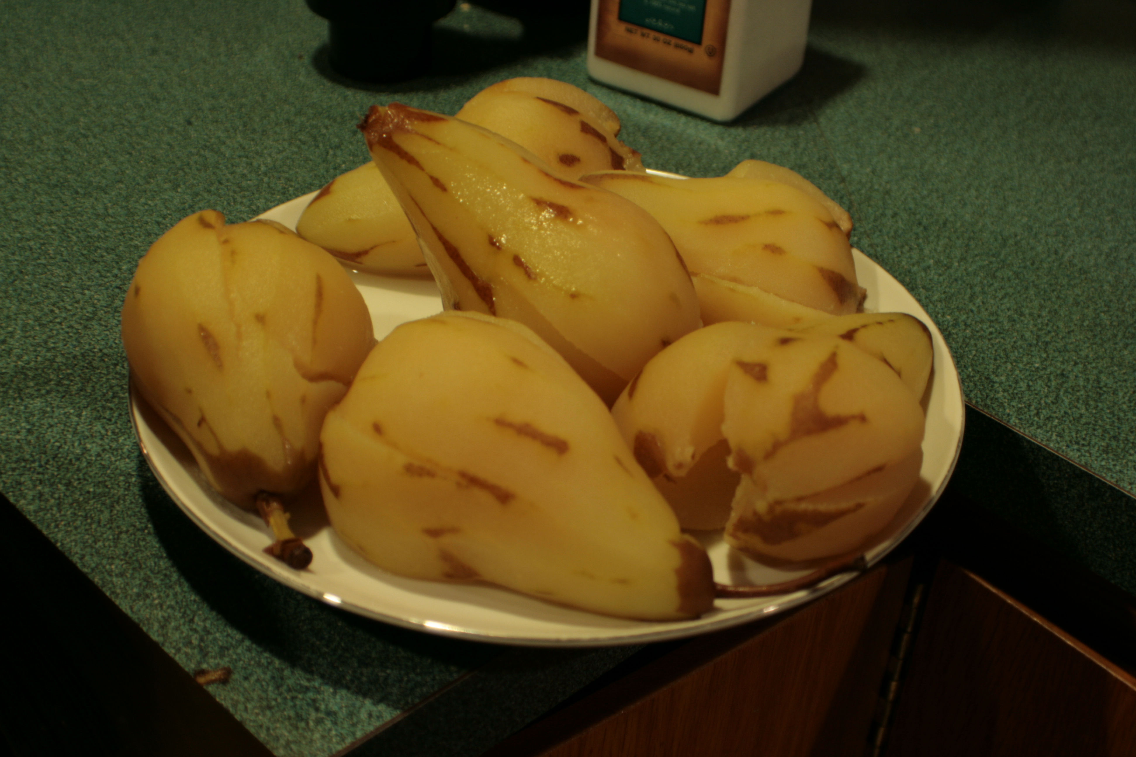 I picked up a pretentious cookbook several years ago looking for recipes I could use to show off. This is where I first encountered the concept of poached pears, and I’ve become quite fond of them as a consequence. So when the Professional Pastry Chef gave me helpful instructions of the, “Boil for five minutes, then simmer until done,” I broke out that other book to see if I had time to clean things. I did. It’s as if that other cook book is useful.