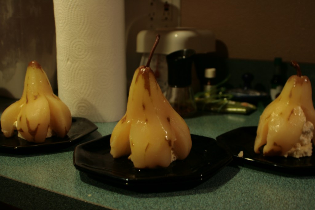 Since I could only fit six of the eight pears into my pot, I went ahead and served the remaining two pears as dessert for Tuesday’s dinner. This time, though, I warmed up some ganache I just happened to have in my fridge and drizzled that over the final product. It was a huge improvement. I call my creation Pears Clytemnestra. Because she was cooler than Helen, and that’s how my kitchen rolls.