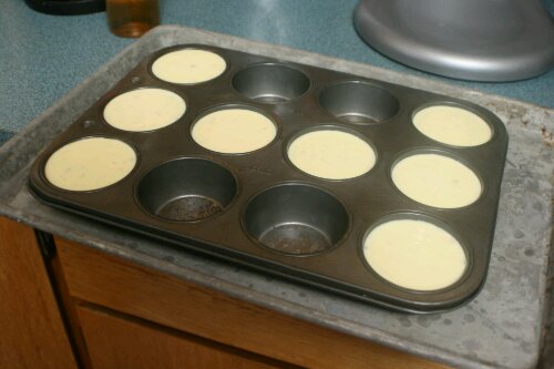 Here comes the part where I got clever. Rather than fill ramekins that weren’t quite the right size or shape with the custard for baking, I decided to use a cupcake pan that wasn’t quite the right size or shape. That meant I could use a cookie sheet for the water bath and that this was generally a lot simpler than custards frequently are. Also, pour spout on the measuring cup!