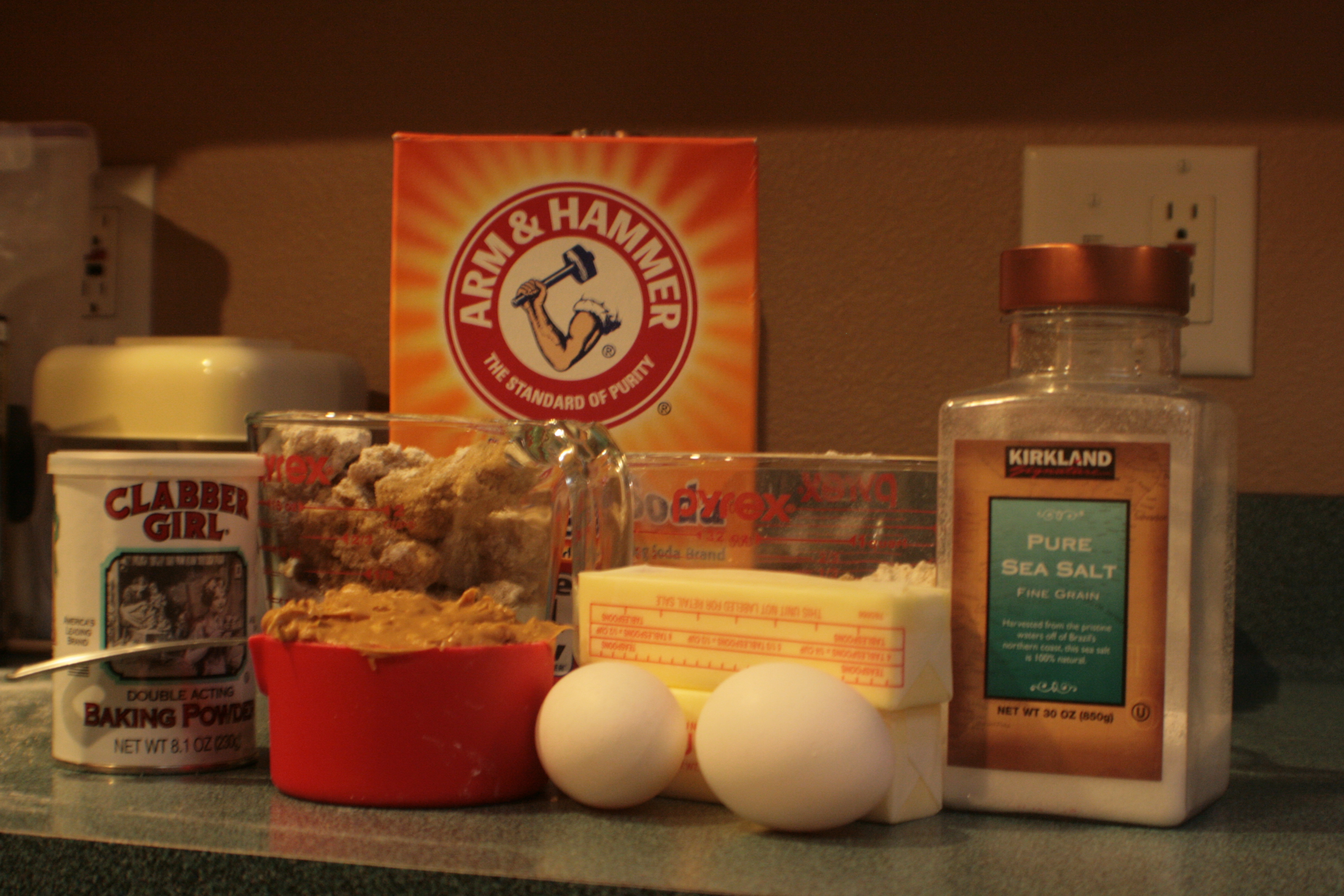 I wanted something that I could bake on Wednesday and which would still be good on Sunday, and which would also fit in my carryon easily and without breaking apart and becoming a problem. This basically demanded peanut butter cookies. So I went to “The New Best Recipe” and pulled out their recipe for peanut butter cookies. This, more or less, is what the starting ingredients look like. (I left vanilla out of the photo. Woops.)