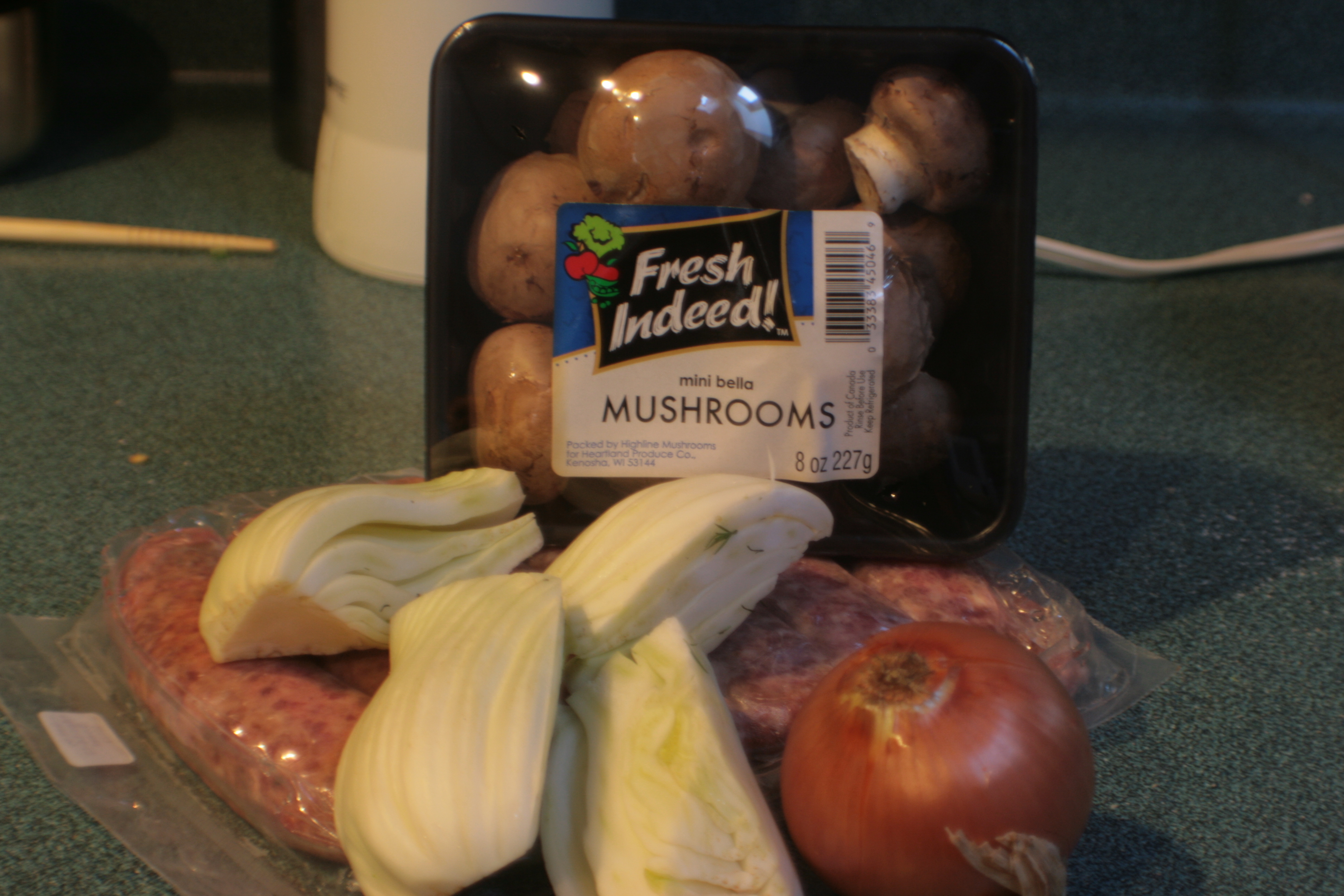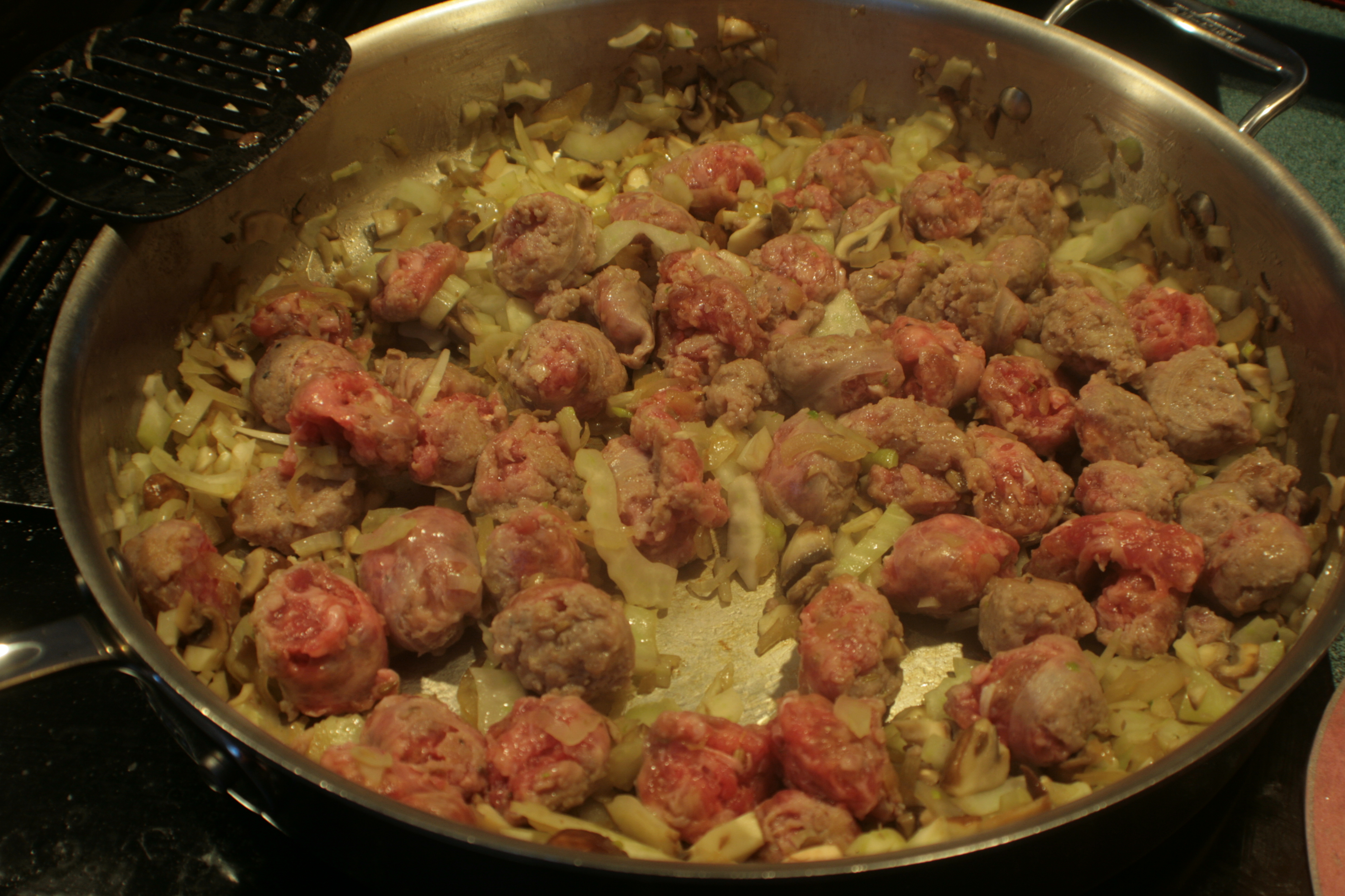 For the filling I didn’t use any recipe. (It’s not like I’d have followed it if I did use one) Instead I grabbed a variety of tasty things lying around the house and designated them filling. That’s Italian sausage, fennel, mushrooms and a yellow onion. Mmmm, french-burrito filling.