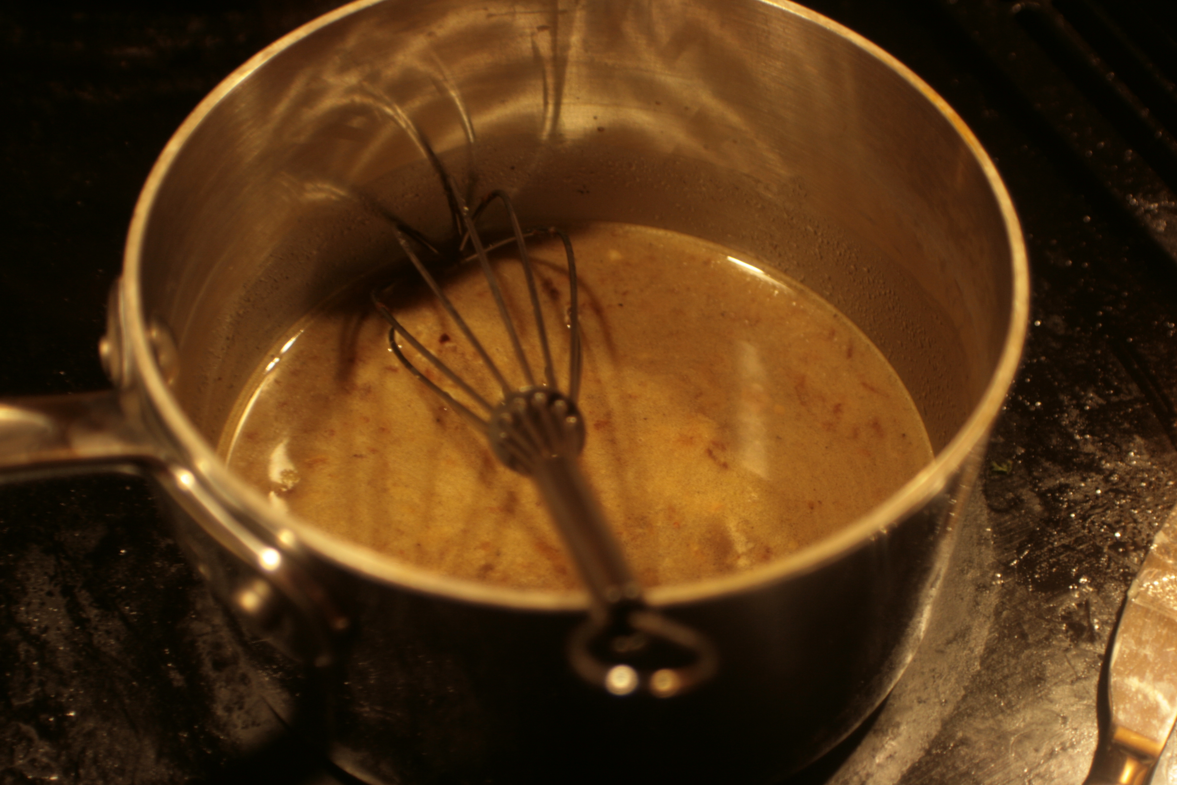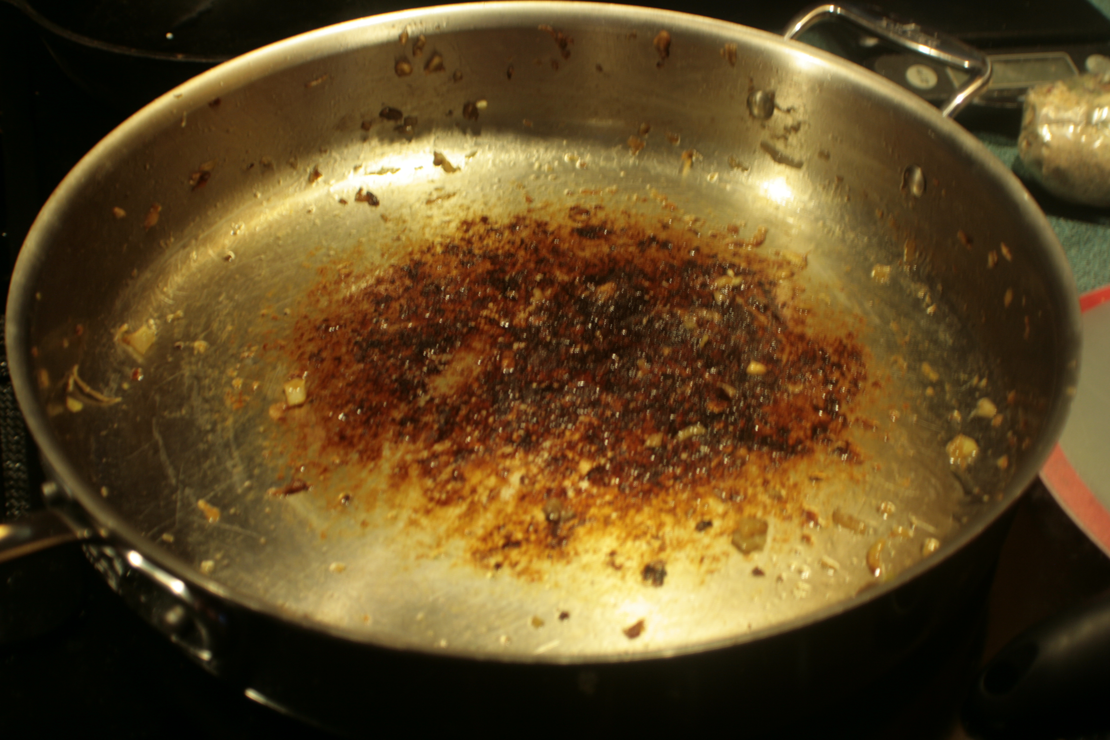 Do you see the gunk cooked onto the bottom of that pan? That’s flavor, also known as tasty. Do not, if you can at all help it, let that sit in the pan. It looks like it’s stuck there, but that’s an illusion. What you want to do is de-glaze the pan. Usually this gets done with something boozy, like wine. I was still out of wine after using it all on the beef stew. Instead, I used lemon juice and vinegar.