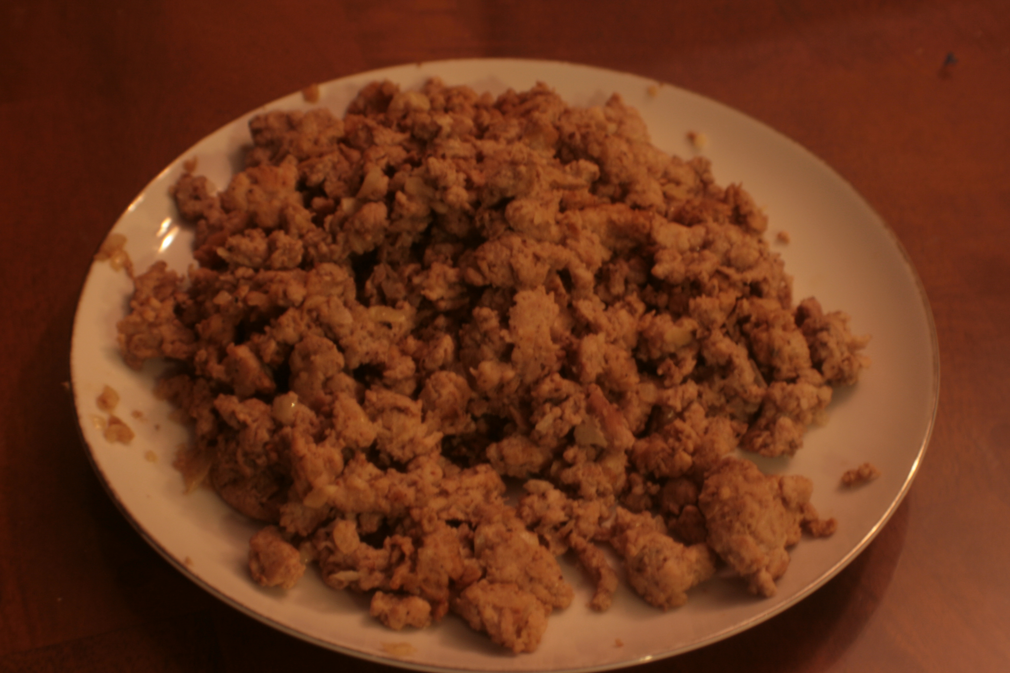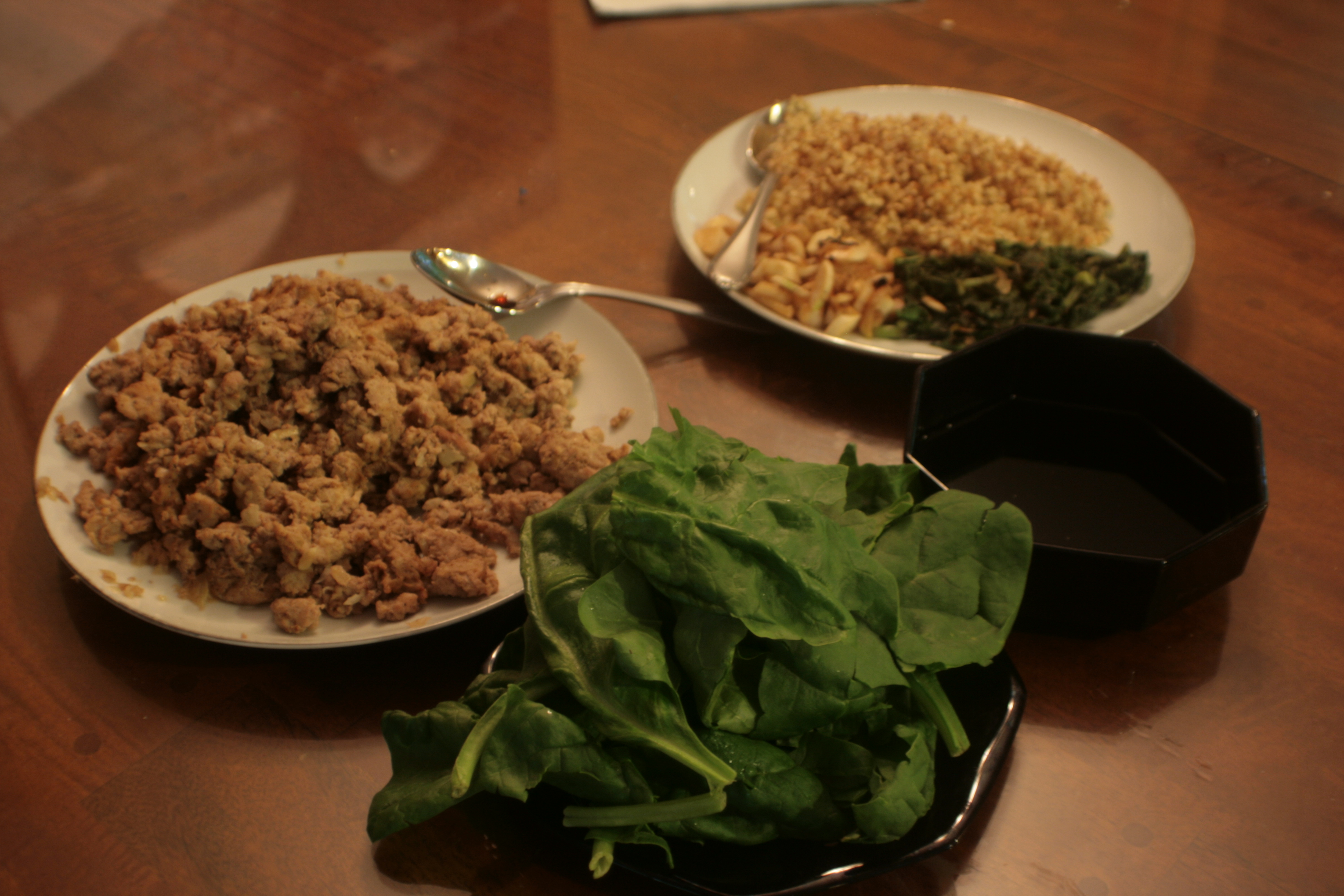That is a plate of ground chicken. I threw a package of chicken thighs into a food processor with a roughly chopped onion, a few cloves of garlic, a dash of salt, and some “Chicken curry” seasoning mix I found in the spice cupboard. Then I processed it until it looked like ground up chicken, and sauteed it in a cast iron skillet. It took two batches. That was okay – I was juggling several things and having multiple batches just meant my timing wasn’t utterly borked.