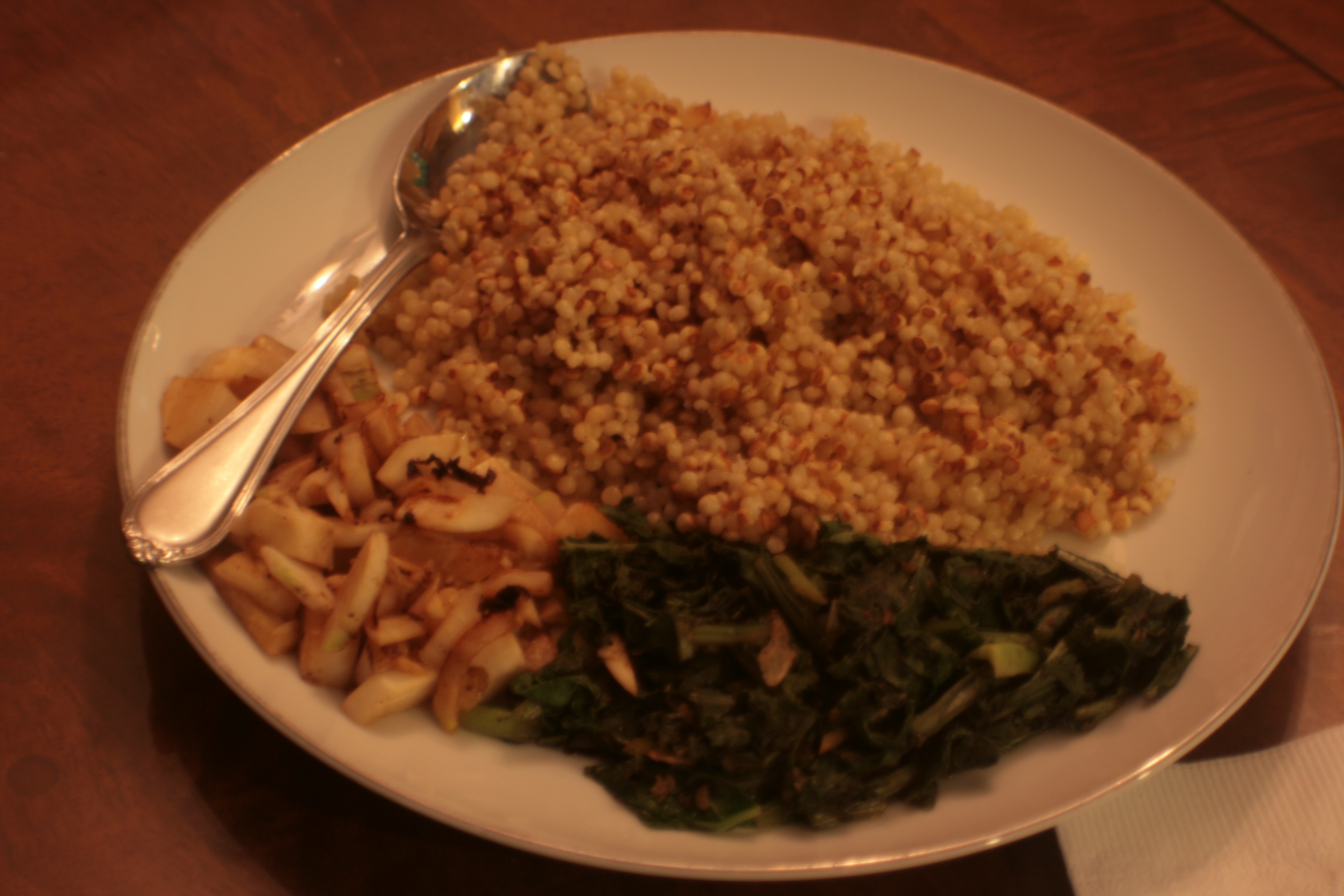 Among the things I was juggling was boiling broth for Israeli couscous, and chopping up the last snow turnip, plus all the turnip greens. I didn’t do anything special to the couscous – it was most there as a starchy filler. I cooked the turnip in the same skillet I’d done the chicken in, with the added bonus of pouring all the juice from the chicken plate back into the skillet. I’ve never cooked a turnip before, but quick research indicated they’re tasty raw or cooked, so I wasn’t too worried about undercooking. The greens I threw into the same skillet again (I loathe doing dishes) and seasoned with a dash of vinegar (hey, it’s good on beet greens!).