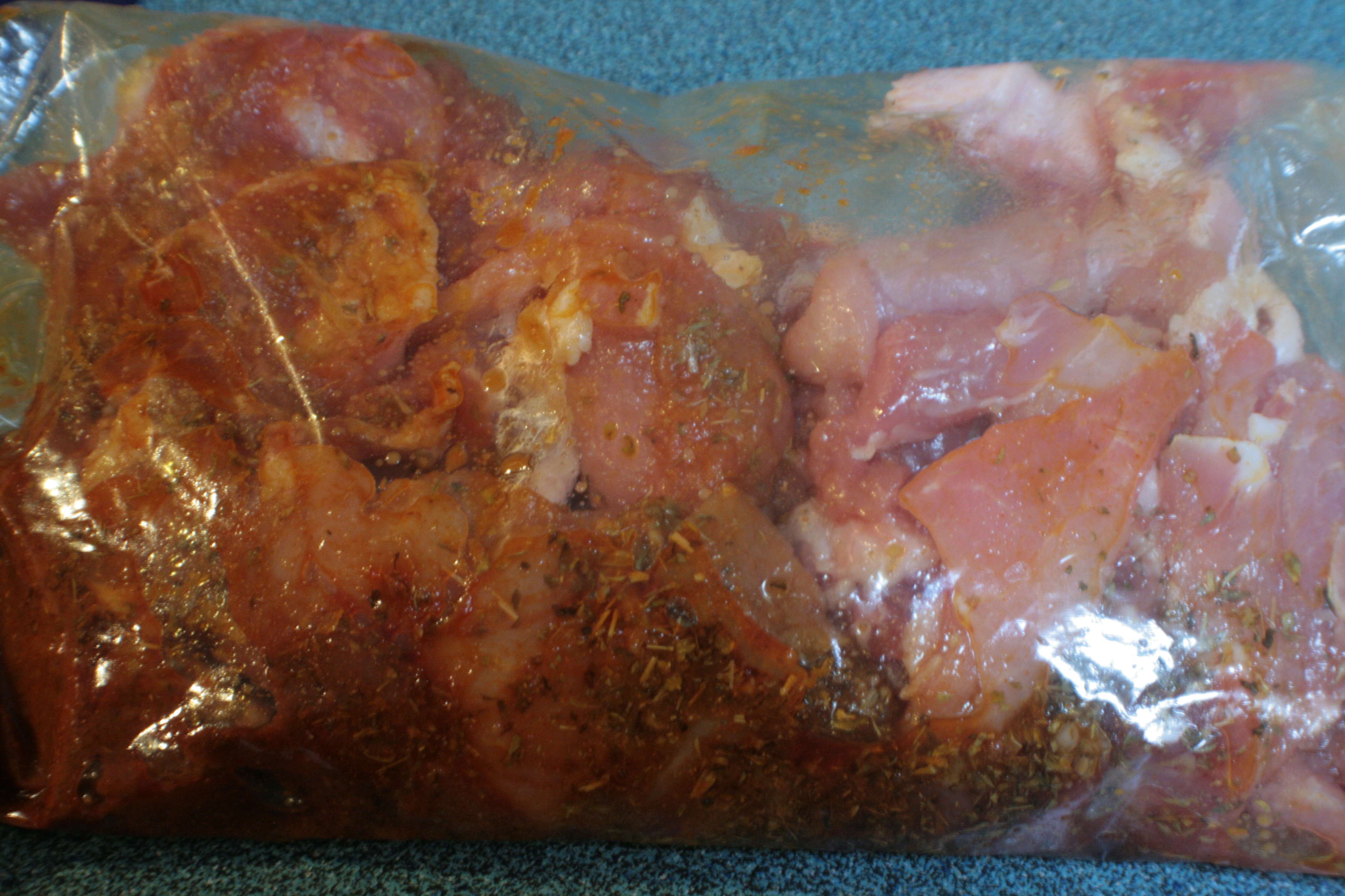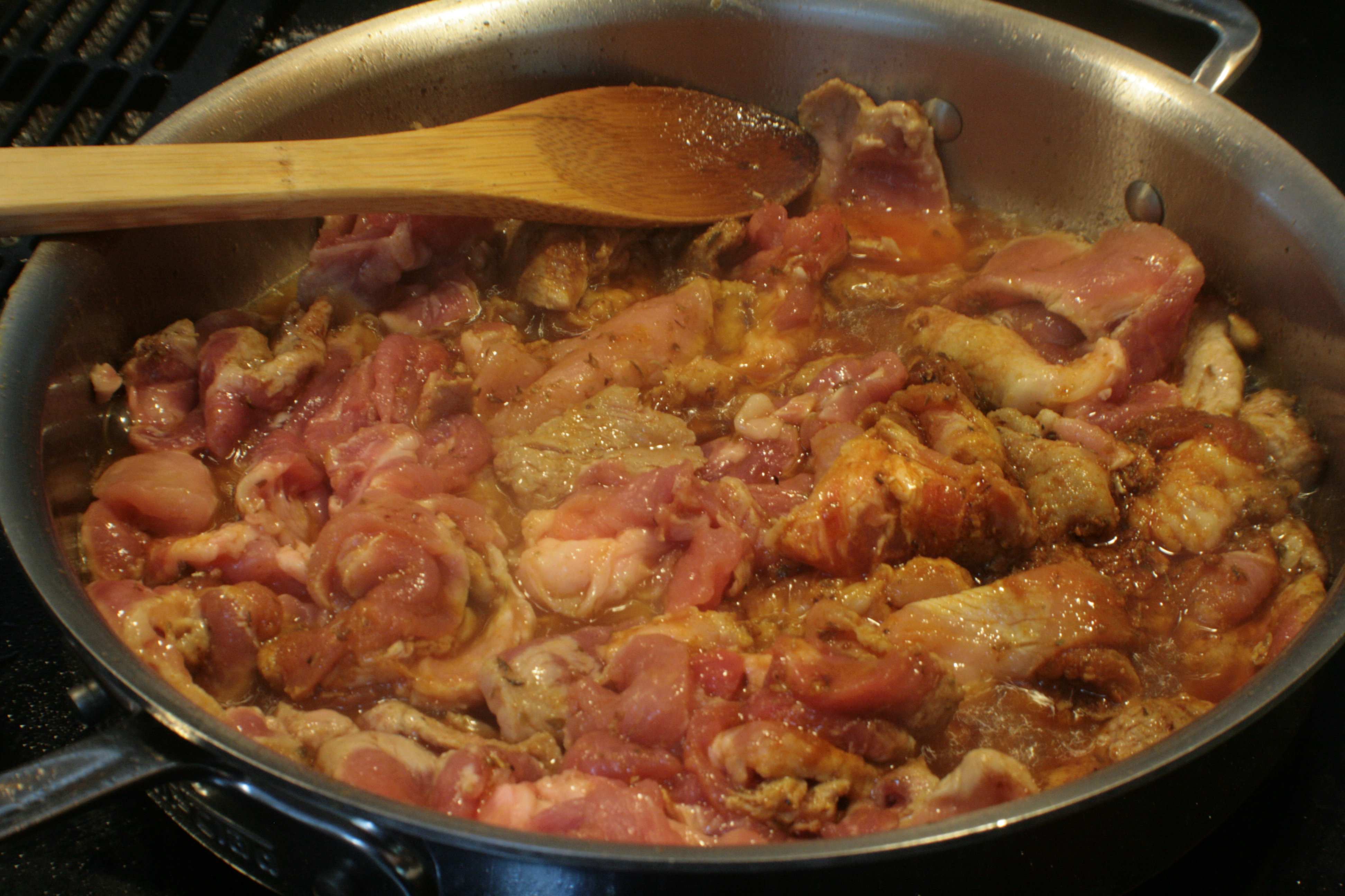 That’s a skillet full of bacon fat left over from brunch that morning. Woe is me, for lo, bacon fat is such a pain to clean out of a skillet. It is, however, mega tasty for cooking pork in. So it was that many hours after sticking the pork in a bag full of tasty marinade, the pork got thrown into a skillet full of a sibling’s stomach fat.