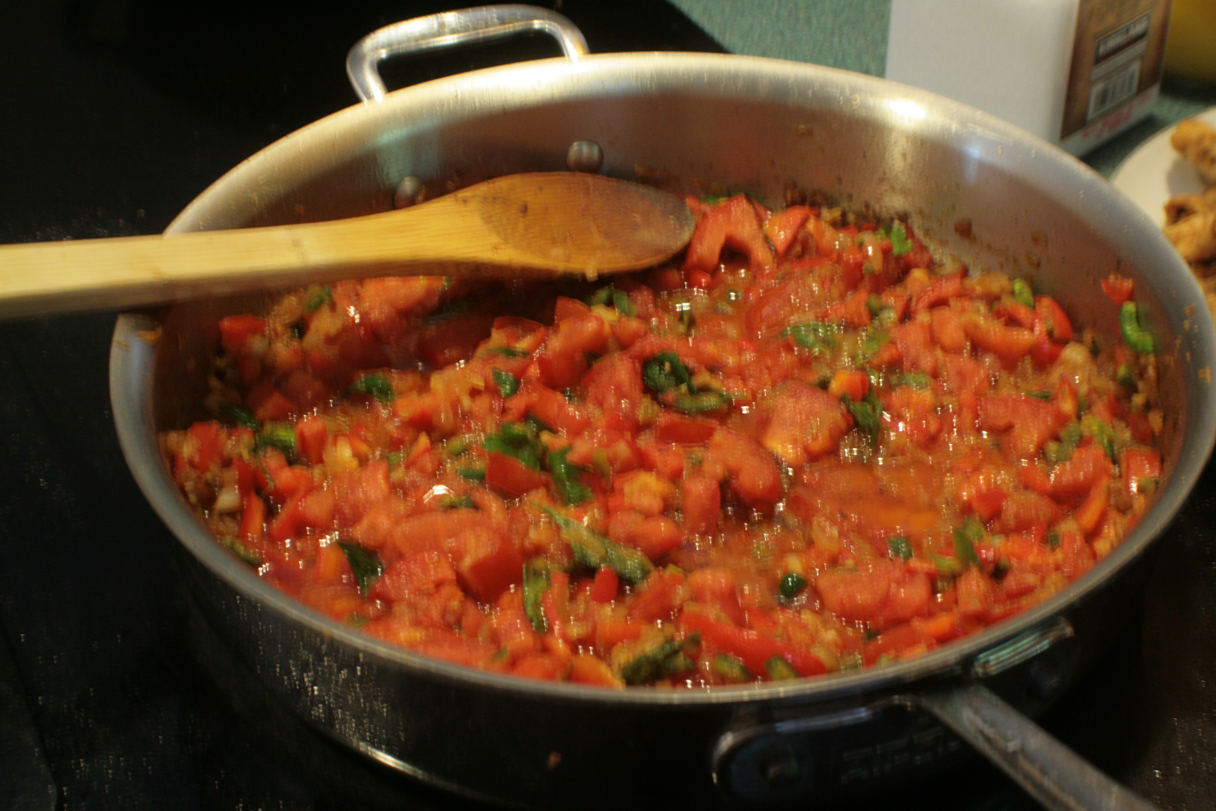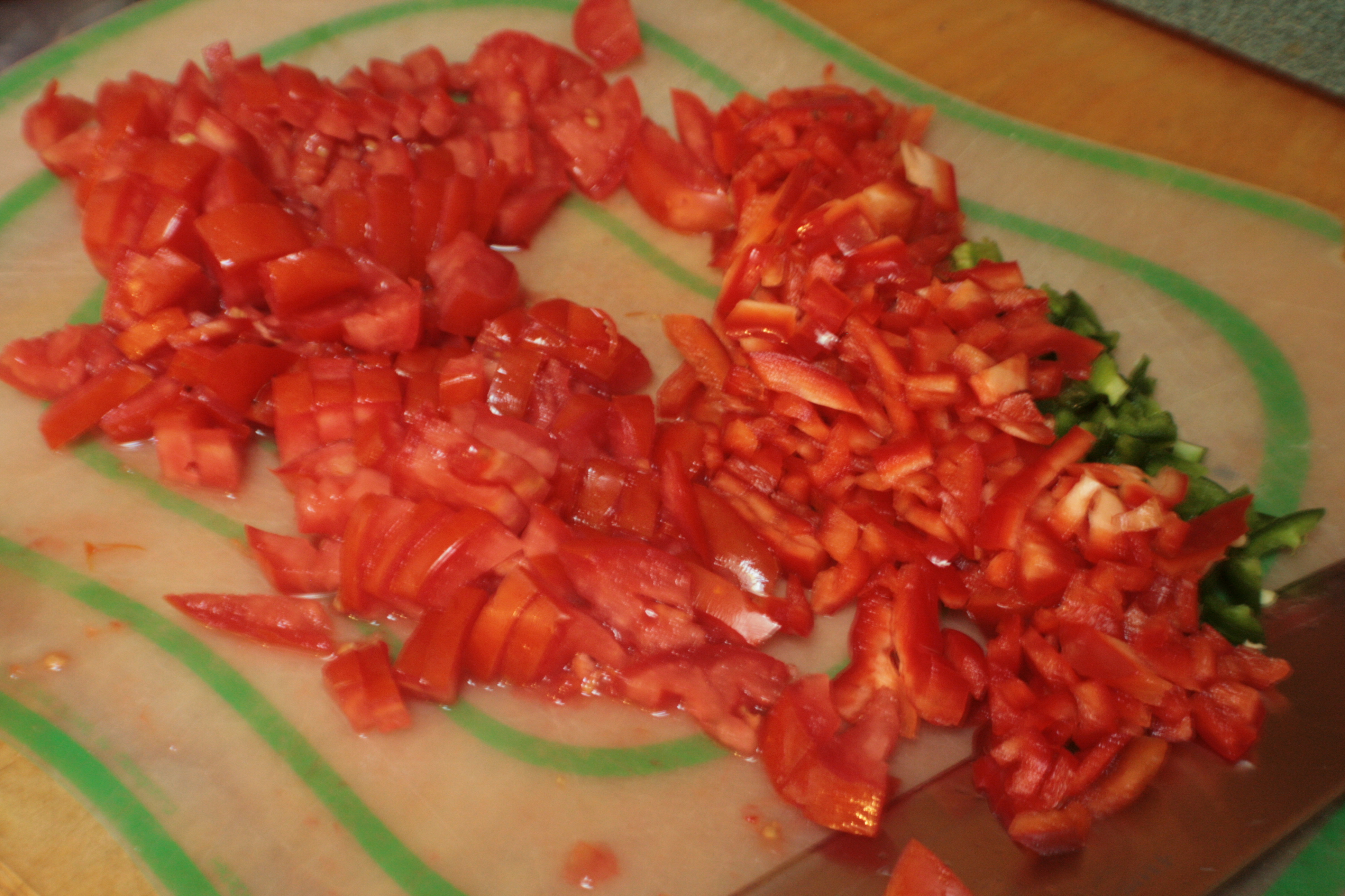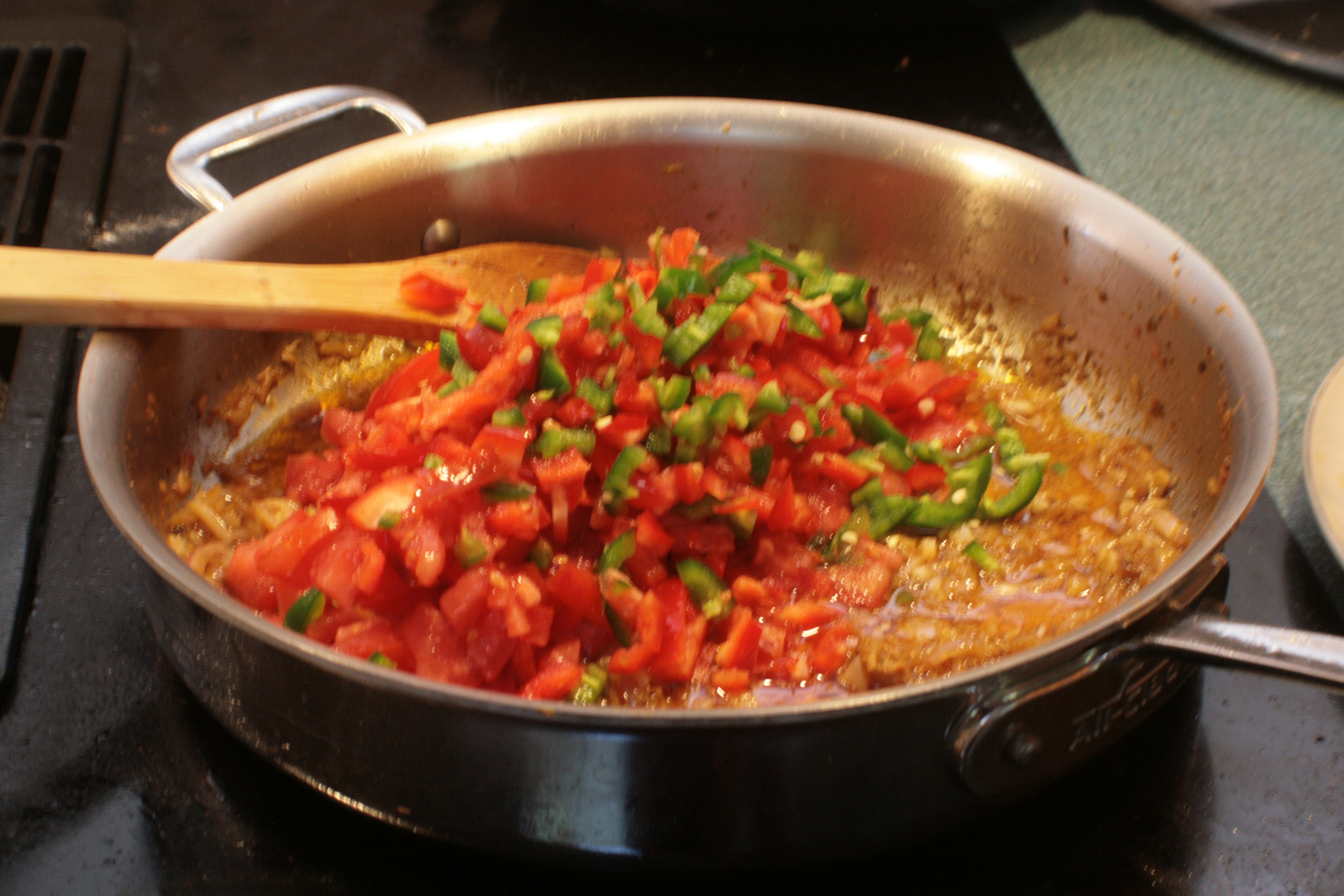 The recipe called for canned tomato. We had fresh slicing tomatoes from the CSA. I considered grabbing a can anyway. Then I stopped being a crazy person. The recipe did not call for any peppers. But the filling paired with the empanada pie recipe did. And we had a jalapeño from the CSA. That got tossed in, too.
