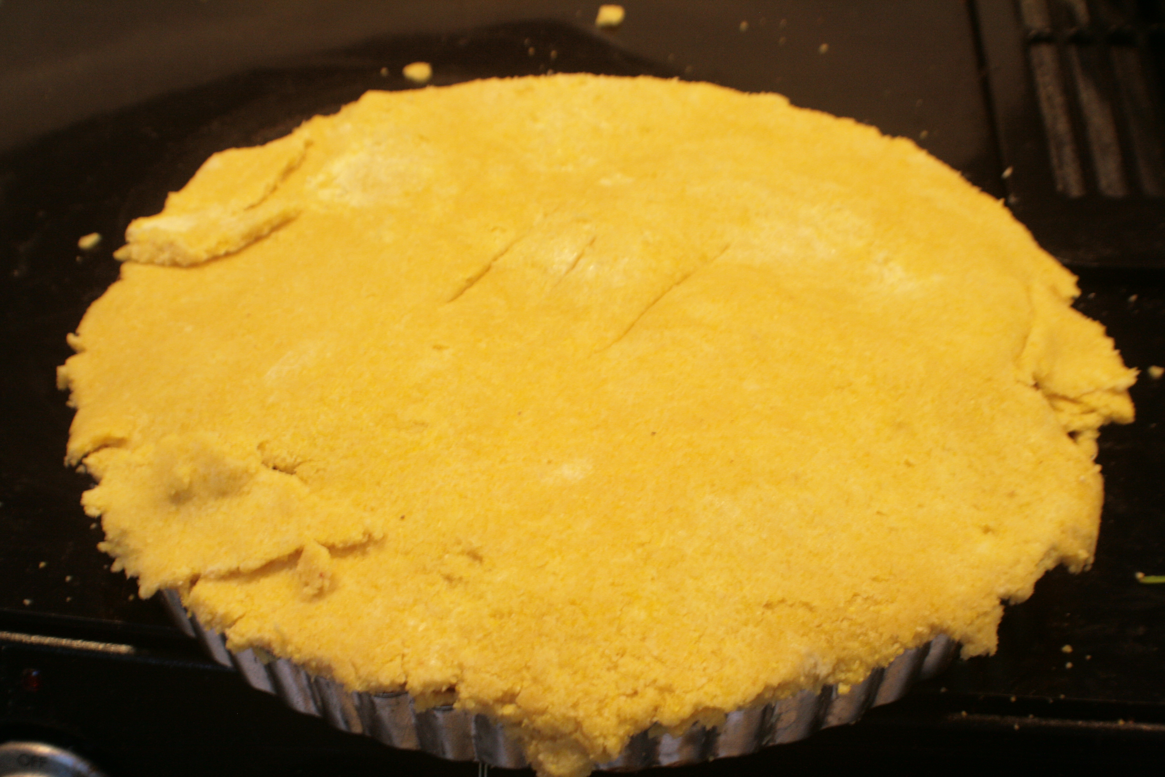 I made the dough for the empanada crust. Wound up being pretty much just like any other pie crust dough, except a bit grainier from the corn meal. I continue to like putting dough into tart shells more than pie plates.