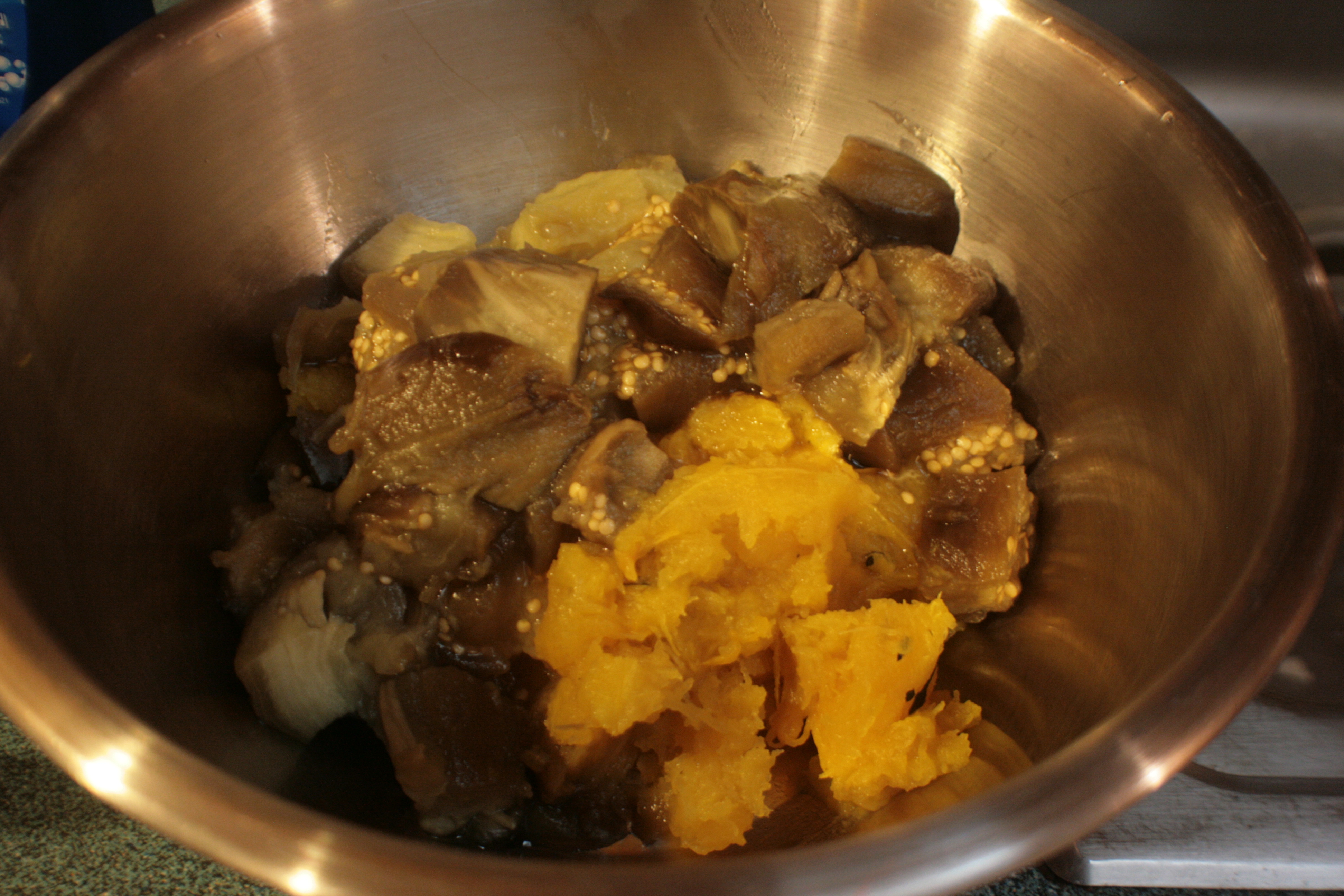 This is what he bowl of roasted eggplant and squash looked like when I finished peeling them. The eggplant was actually pretty easy to do once I stopped burning my fingers on it. The squash was much more complicated, probably because it took a detour from oven to counter and visited “smashed on floor because Anaea’s a clumsy oaf,” land, which had rather unfortunate consequences for its structural integrity.