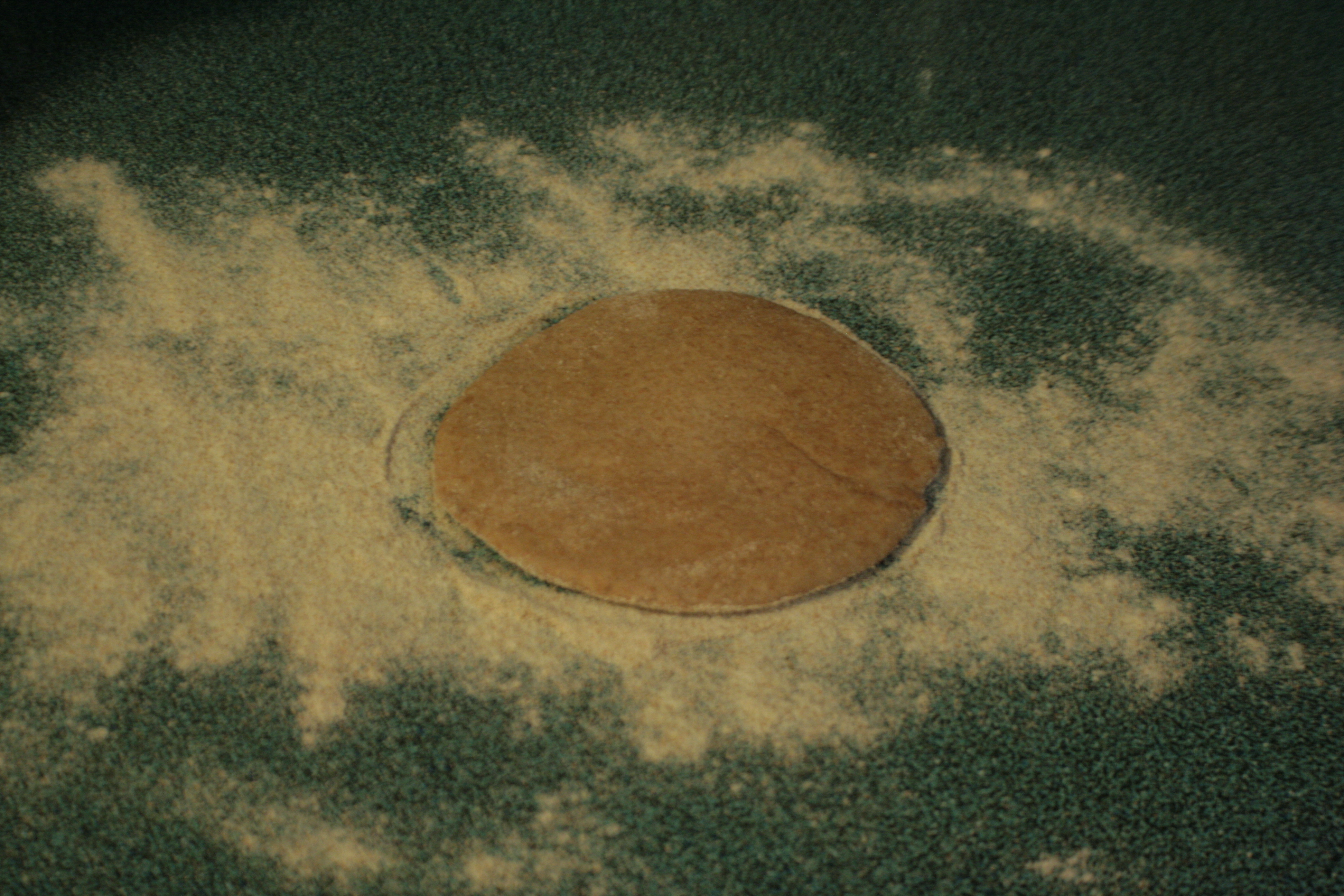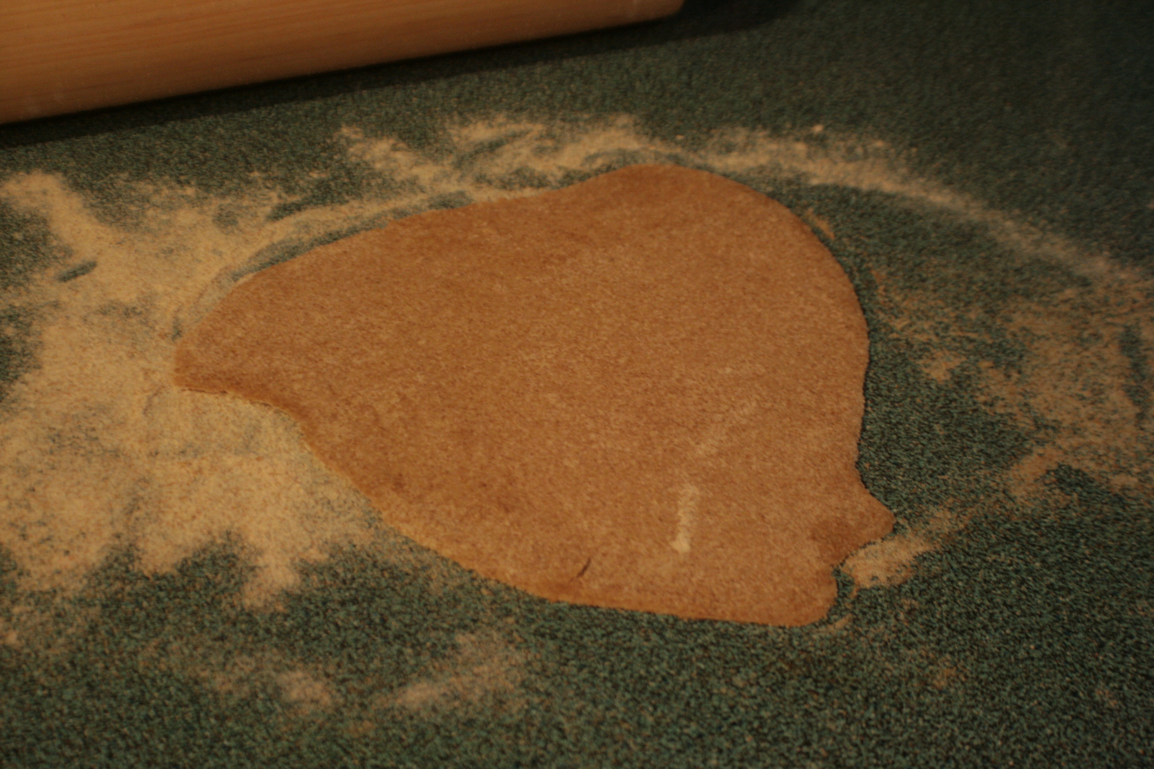 And that’s what the chapati looks like when you roll it out and don’t much care whether you get it perfectly round. I did that twelve times. Half way through I switched to doing it assembly-line style, though, which sped things up considerably.
