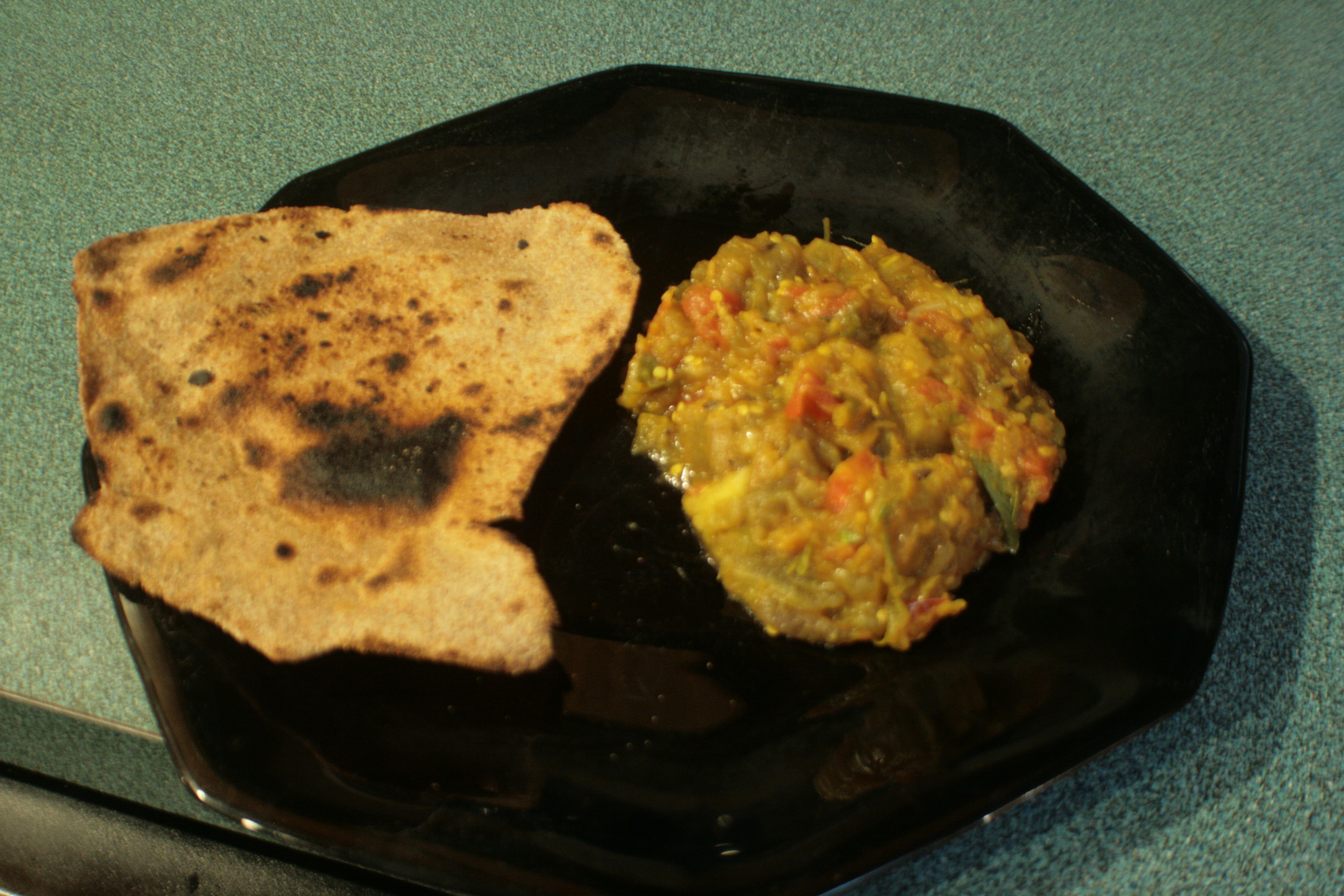 We had an eggplant and a couple squash from the CSA, so I decided to play with this recipe. And to go with it, this recipe for chapatis. The lack of yeast in the chapati recipe was particularly appealing since that cuts a lot of time out of the preparation, and while I had time to futz with dinner, I’m still catching up from things I let slide while I was in Richmond and have about ten other things going on I’d like to keep on top of as well, so quick was appealing.