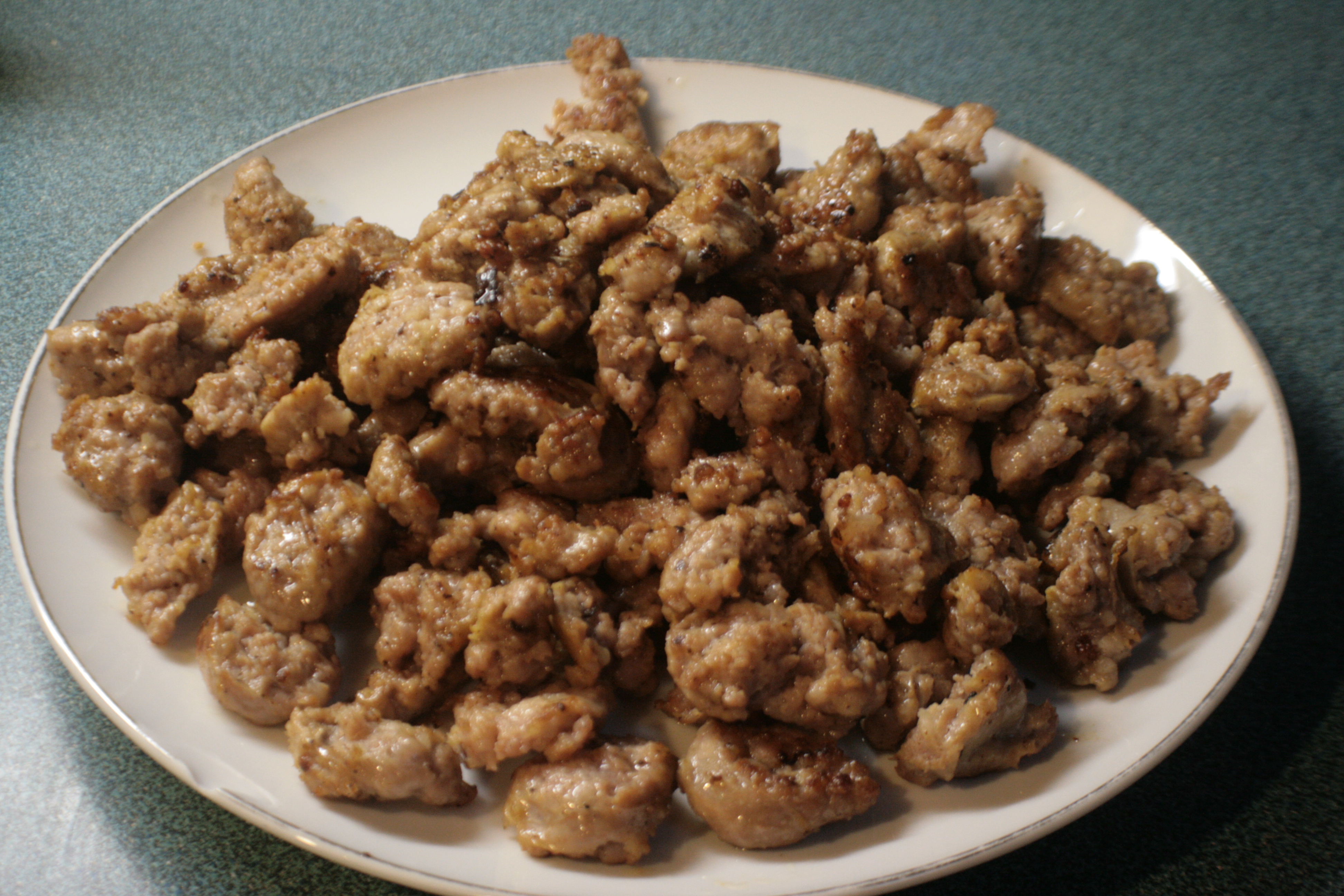 And that’s a plate full of chopped up sausage that’s been skillet fried. The fact that the sausage started life as a brat is very Wisconsin, but other than that, sausage is legitimately Southern when thrown in with gravy and biscuit-like objects, so my sacrilege score on this particular meal is quite a lot lower than has been usual.