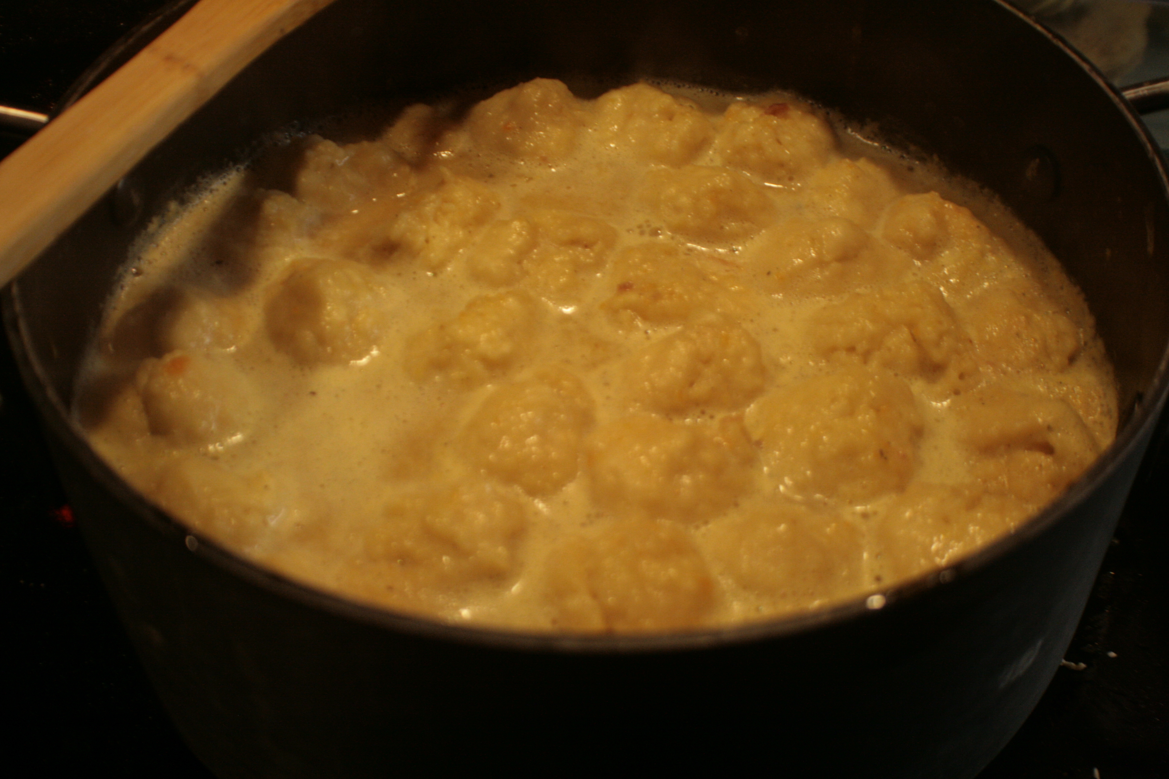 And that’s the final stage of the dough. The recipe calls for rolling it out and then being orderly about cutting out dumplings or pinching off chunks. I’ve never had the patience for that – rolling out biscuit dough makes a mess because it’s sticky. I pinch the dough right out of the bowl, roll it in my hands a bit, then toss it into the boiling, milky broth.
