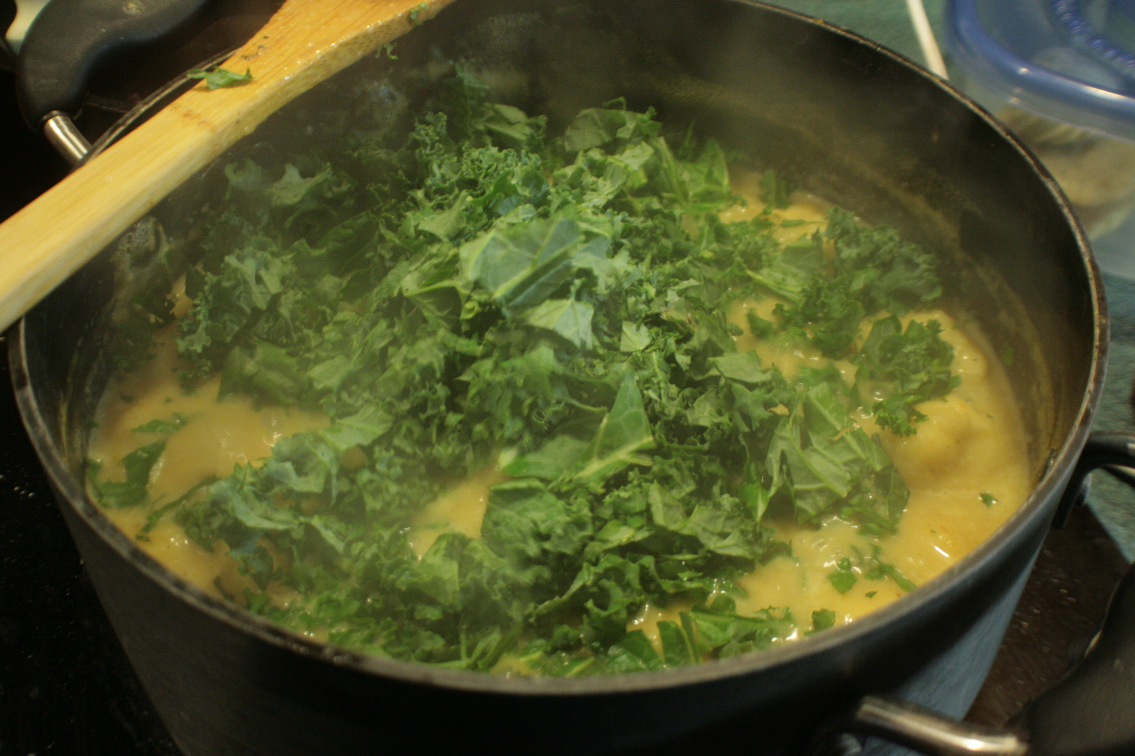 Here’s where I made my major departure from status quo. You don’t want to eat kale raw; it’s too tough. But that toughness means it stays green and sassy when you do something like toss it into a pot full of sausage, boiled dumplings, and gravy. It’s like a pop of lovely nature in your bowl of delightful cardiac arrest.