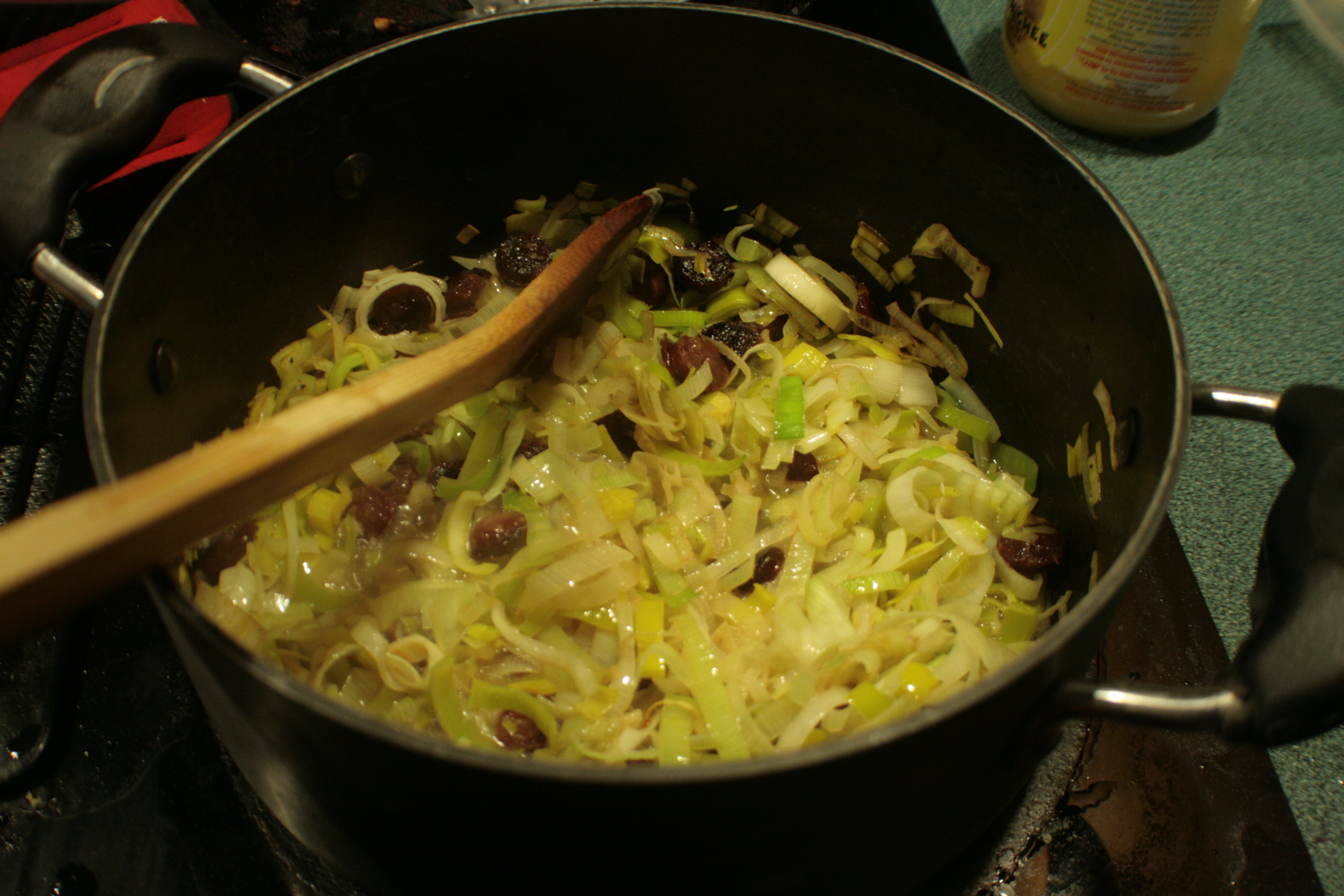 The leeks smelled very nice, too, though not quite so overwhelmingly wow as the sausage-butter combo. They were really fun to chop up, though. I haven’t done much with leeks, but they’re sorta like what you’d get if an onion decided to be a fan. A really ineffective, tasty fan.