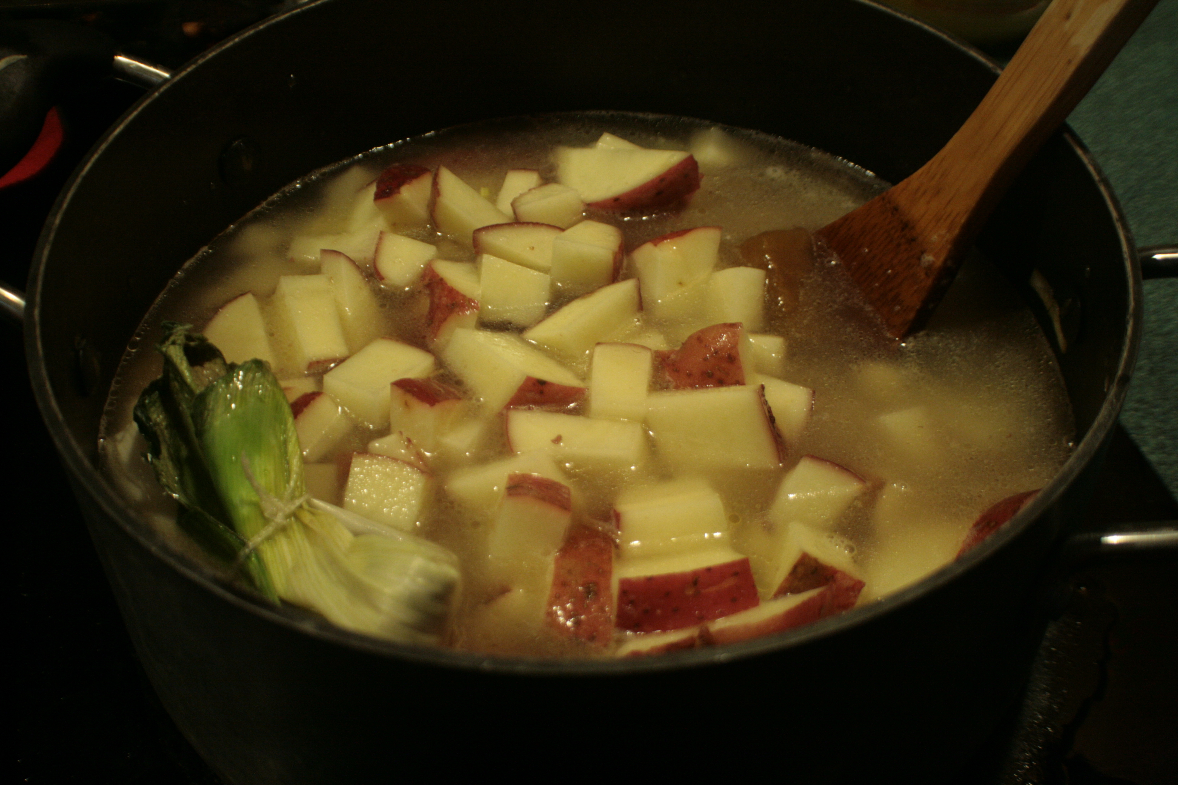 This is what hte pot looked like once the potatoes were soft and we were ready to get our puree on. The bouquet had gotten very wilty and scooping it out without it falling apart present a minor challenge. My trusty wooden spoon was up to the task, though, so we prevailed.