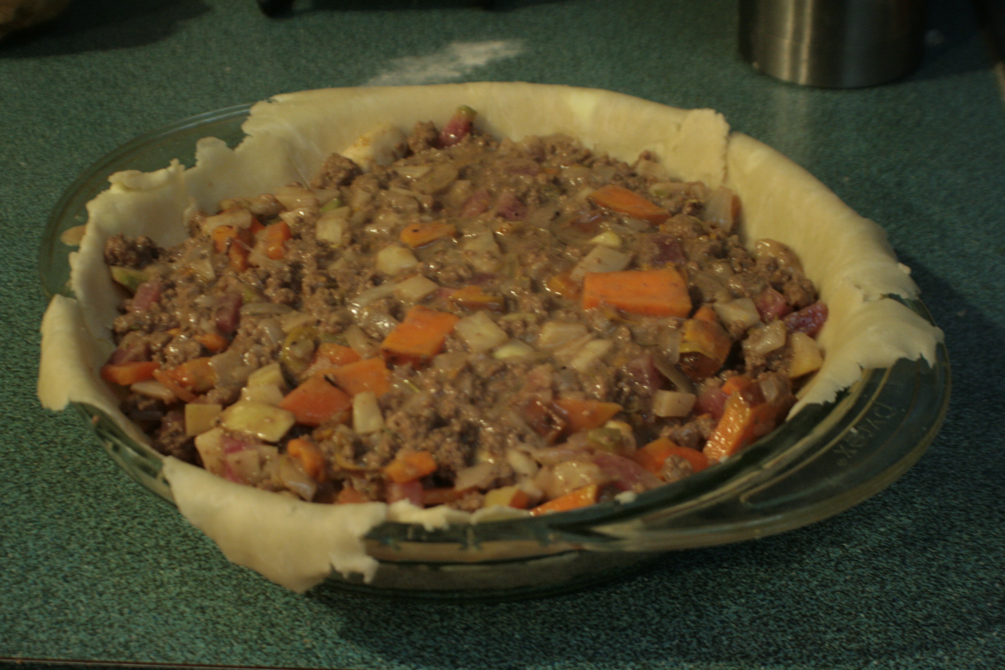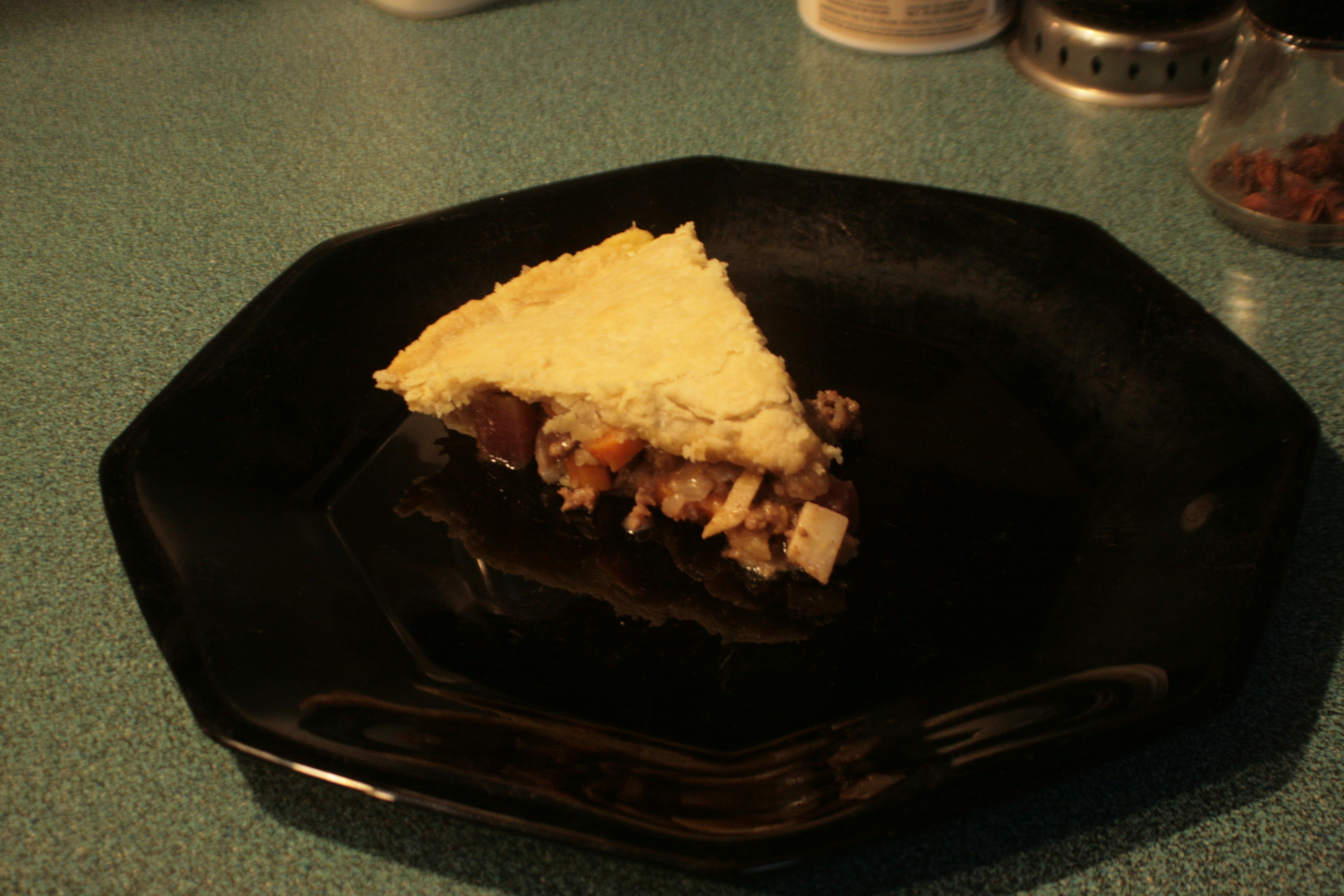 Only half of the filling fit in the pie, but I’d figured that would be the case the moment I decided to use all the ground beef. The other half has been tucked away in the freezer for some cold, produce-less winter night, and I’ll just be a crust away from another pie. Or I could make mashed potatoes and turn it into a cattle-herder-pie. Or do bread dough and make stuffed rolls. Or…well, I’ll do something.