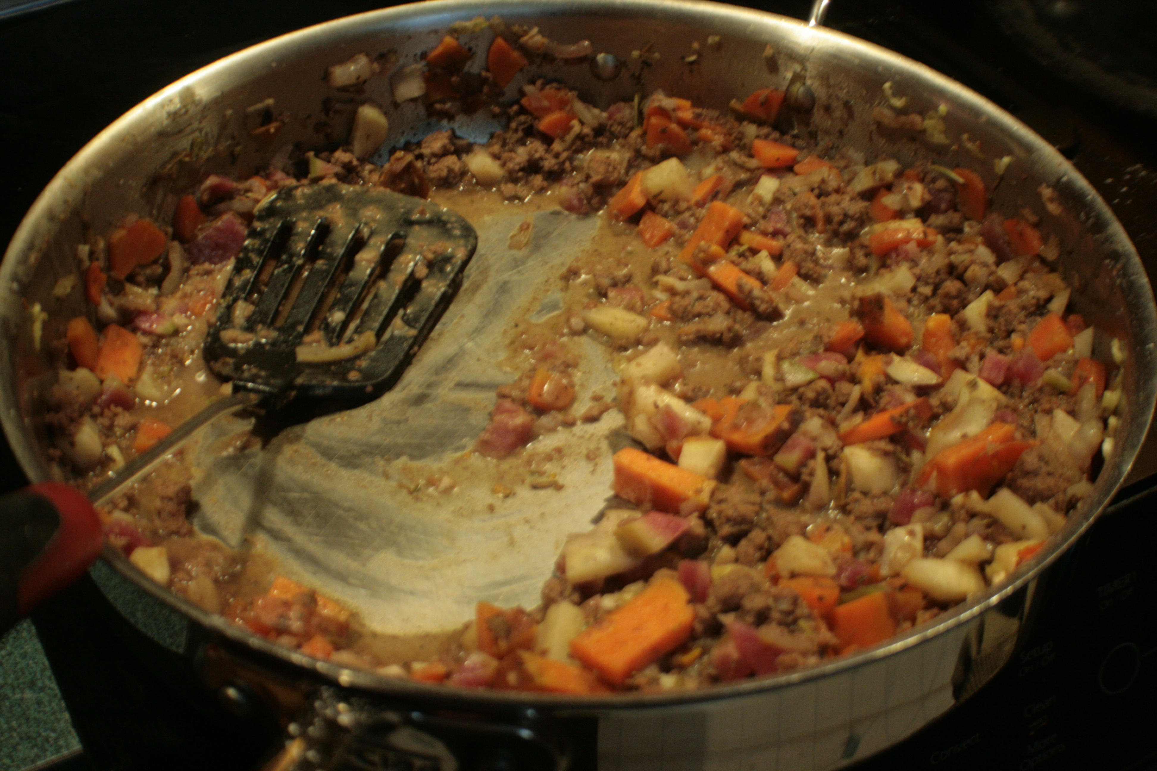 To get a gravy going I just added a bunch of stock. All the proportions were eyeballed, and I wound up using just half of most of the vegetables, which was the right call. This winds up meaning that with nothing more than my eyeballs I did a massively better job of judging good portions than half the recipes I’ve used for CSA projects this year. I say this out loud so that I will remember it, and trust my own judgement the next time I read a recipe and go, “Is that right? It must be, since whoever wrote it ought to know what they’re doing.”