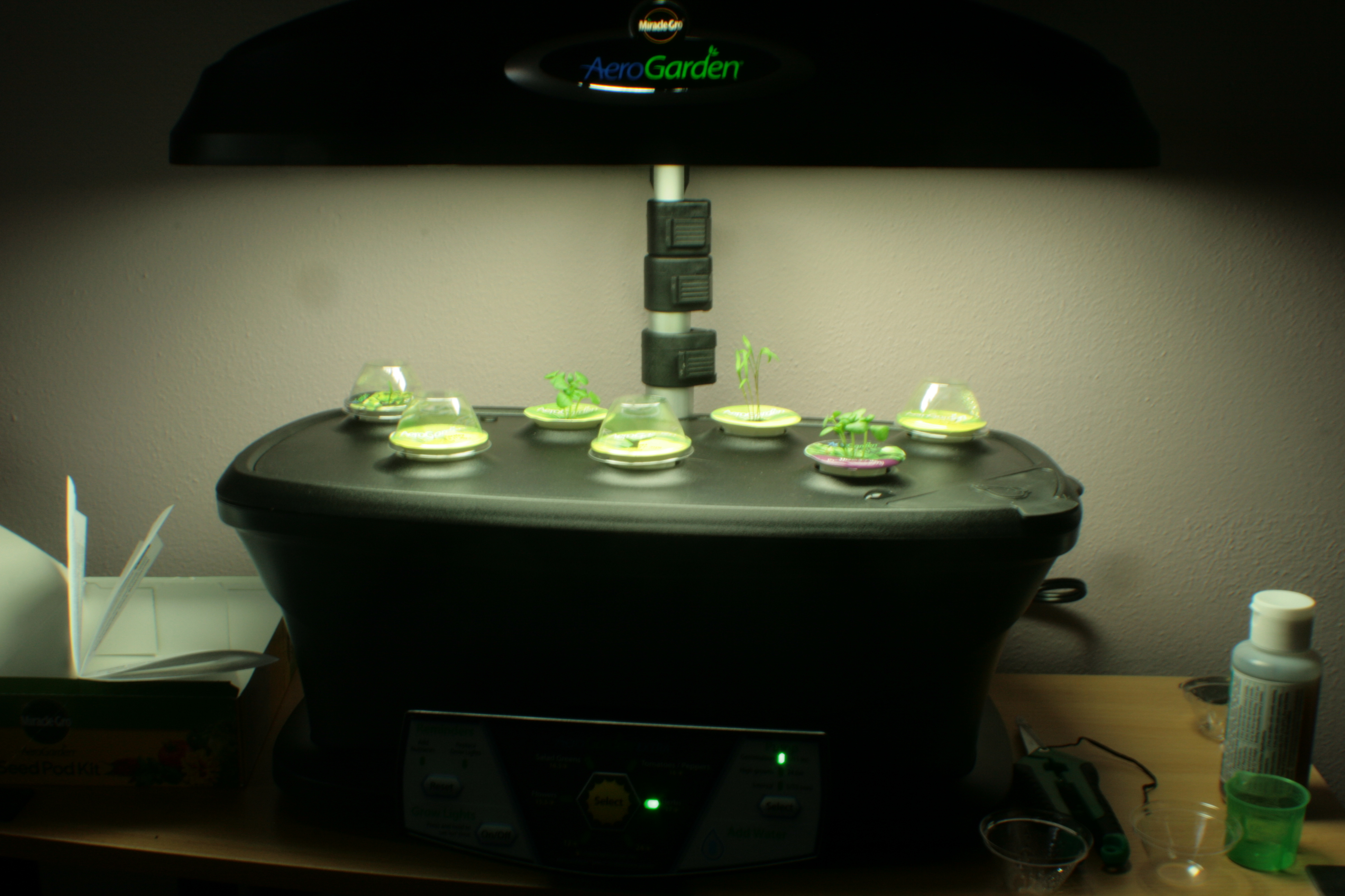 “Don’t worry,” the Aerogarden instructions said to me as I read them, “We are completely, utterly, 100% idiot proof. There are things you can do to make your garden grow better, but short of being a deliberately destructive imbecile, your plants will grow and your shame will be redeemed.” I may be paraphrasing. “When your plants need to be watered, a helpful light will flash and say, ‘Please water me, for lo, I am thirsty.’ When your plants need food, another light will flash and do an Oliver impression.”