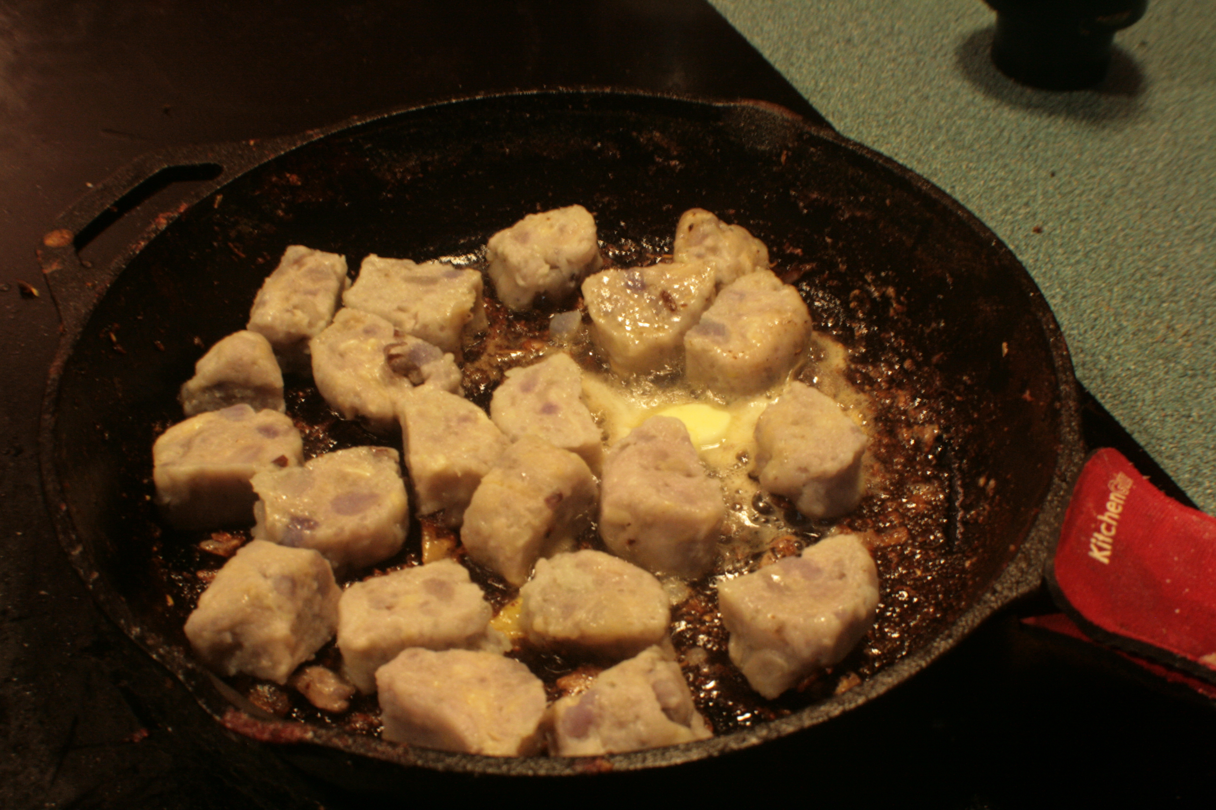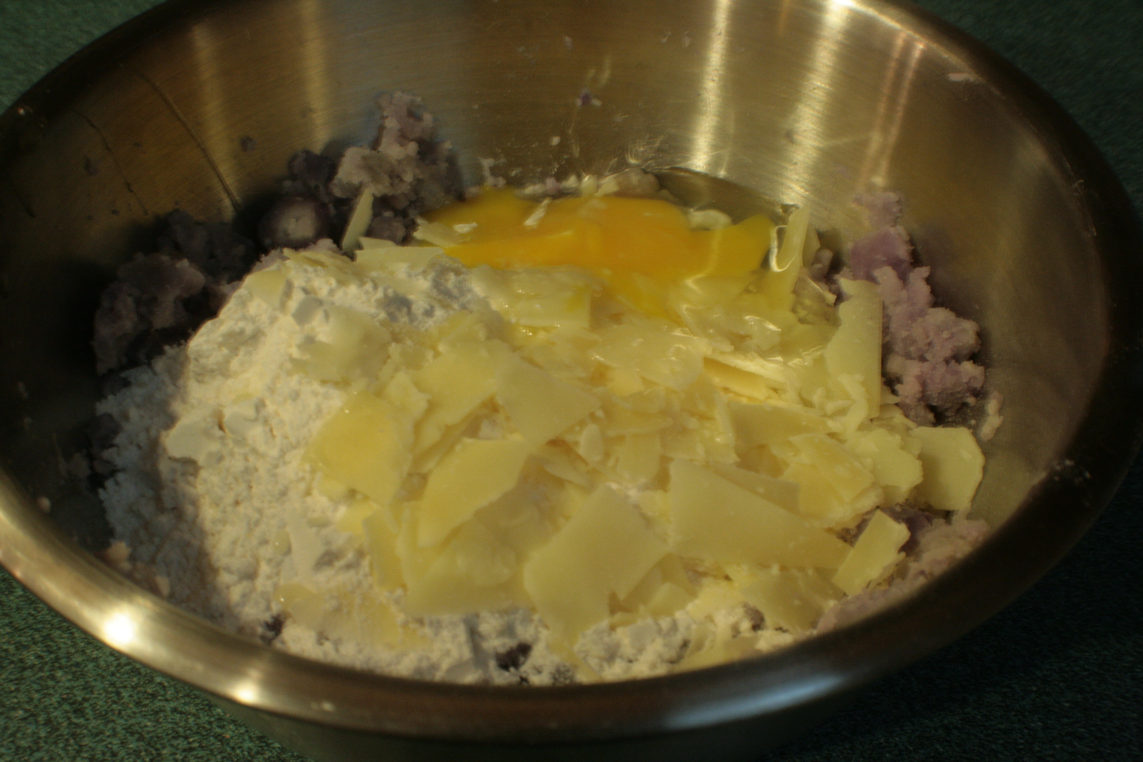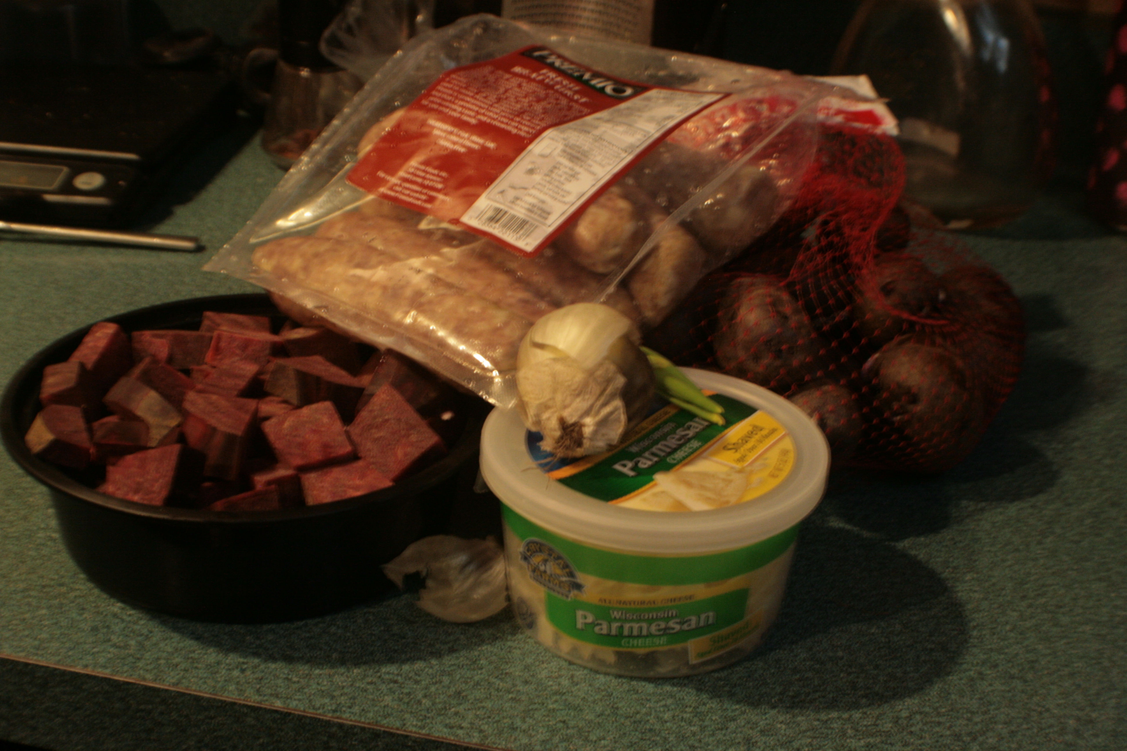 That’s more or less the ingredients for what I did. A pack of brats left over from the summer, 2lbs of blue potatoes, a slightly-past-optimal-use-date shallot, and half a beet I chopped for dinner a week prior then didn’t use. Also, Parmesan cheese, because I was making gnocchi, which is pasta, and cheese always goes well pasta.