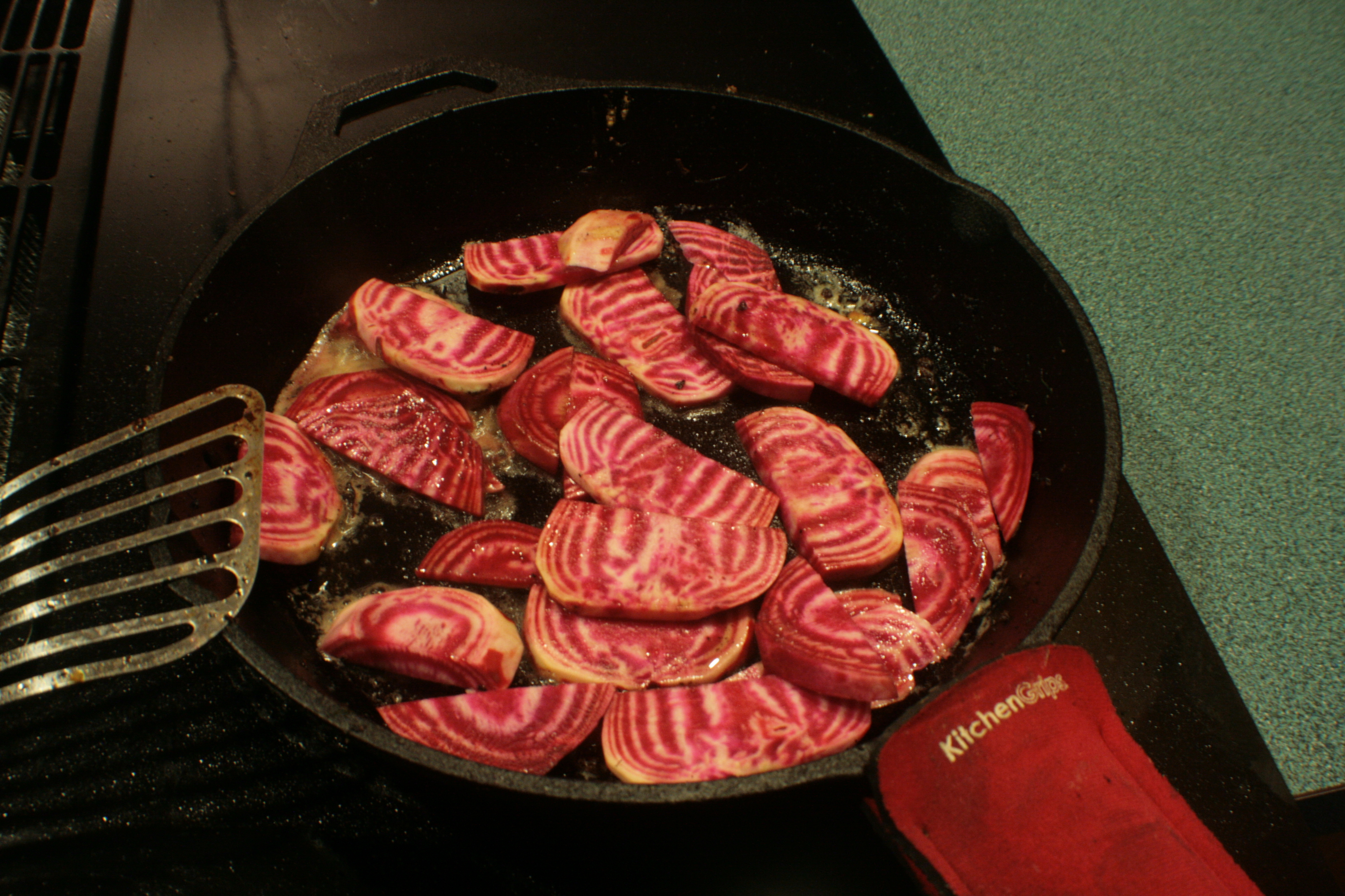 We had green onions in the fridge that were starting to look distinctly unhappy. So I chopped up all of them and tossed them into the skillet with the radishes. There’s also a healthy, generous portion of butter in there.