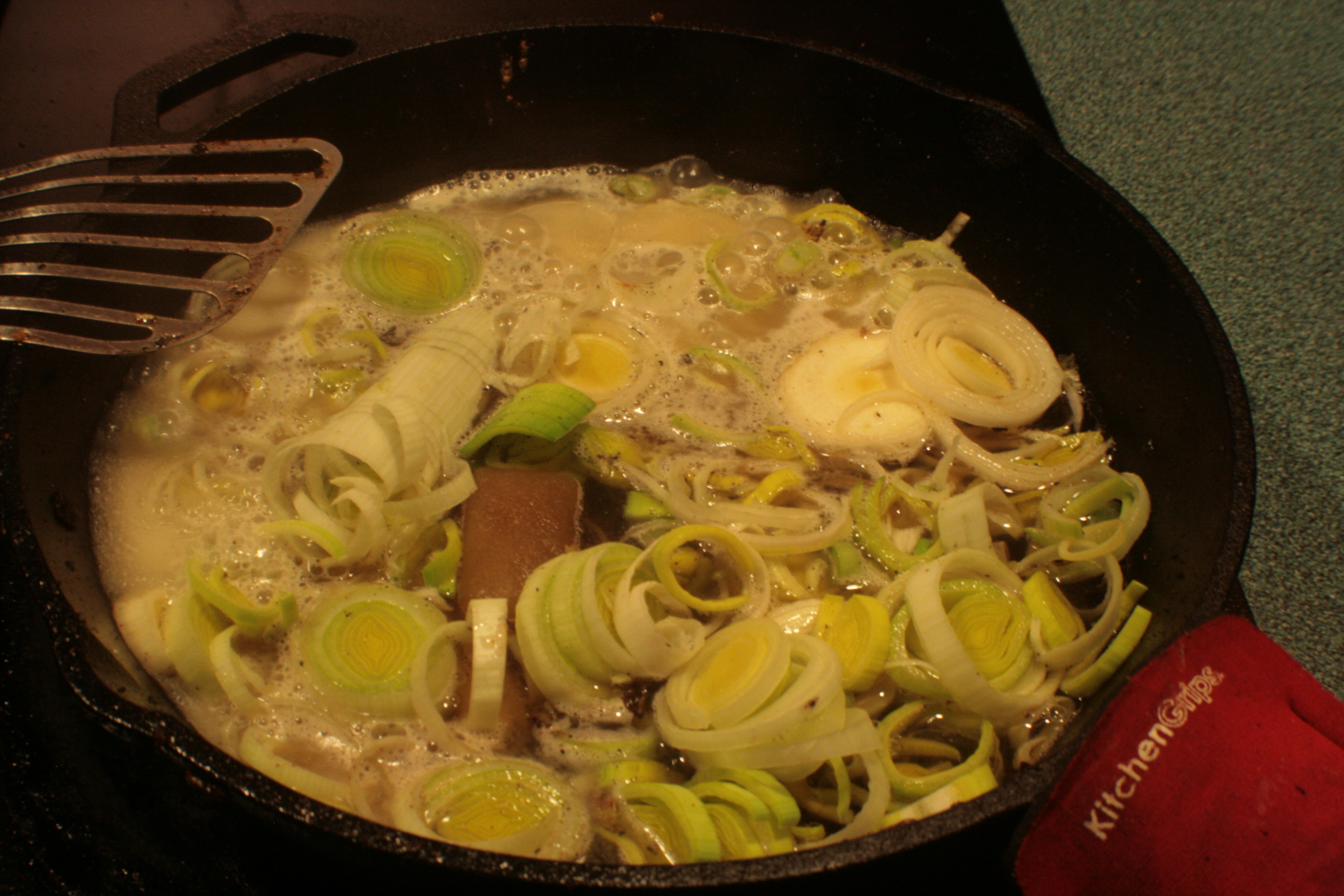 Then I scooped all that out, and threw a chopped leak into the skillet with one of our frozen chicken stock cubes and a cup of water. No idea how long that ought to go either, but I let it cook down until most of the liquid was gone, then added some butter.