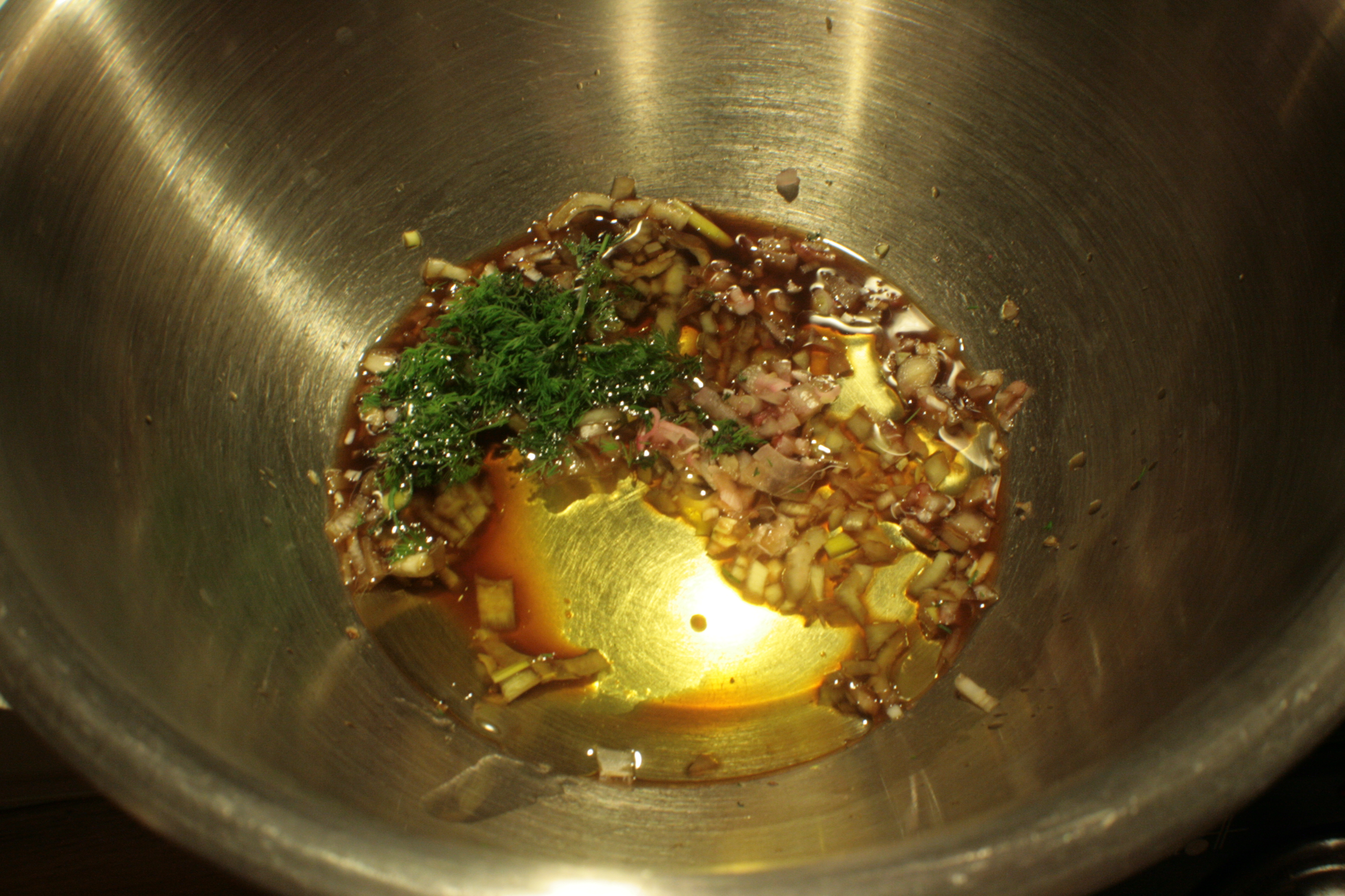 Foy, for those of you not following my random squeeing on google+ and twitter, has gotten quite productive. The fennel, in particular, is being aggressive about growing all the time. So I had a lot of fennel on hand, and threw that into a vinagarete that involved other tasty things like shallots, lemon juice, and red wine vinegar.