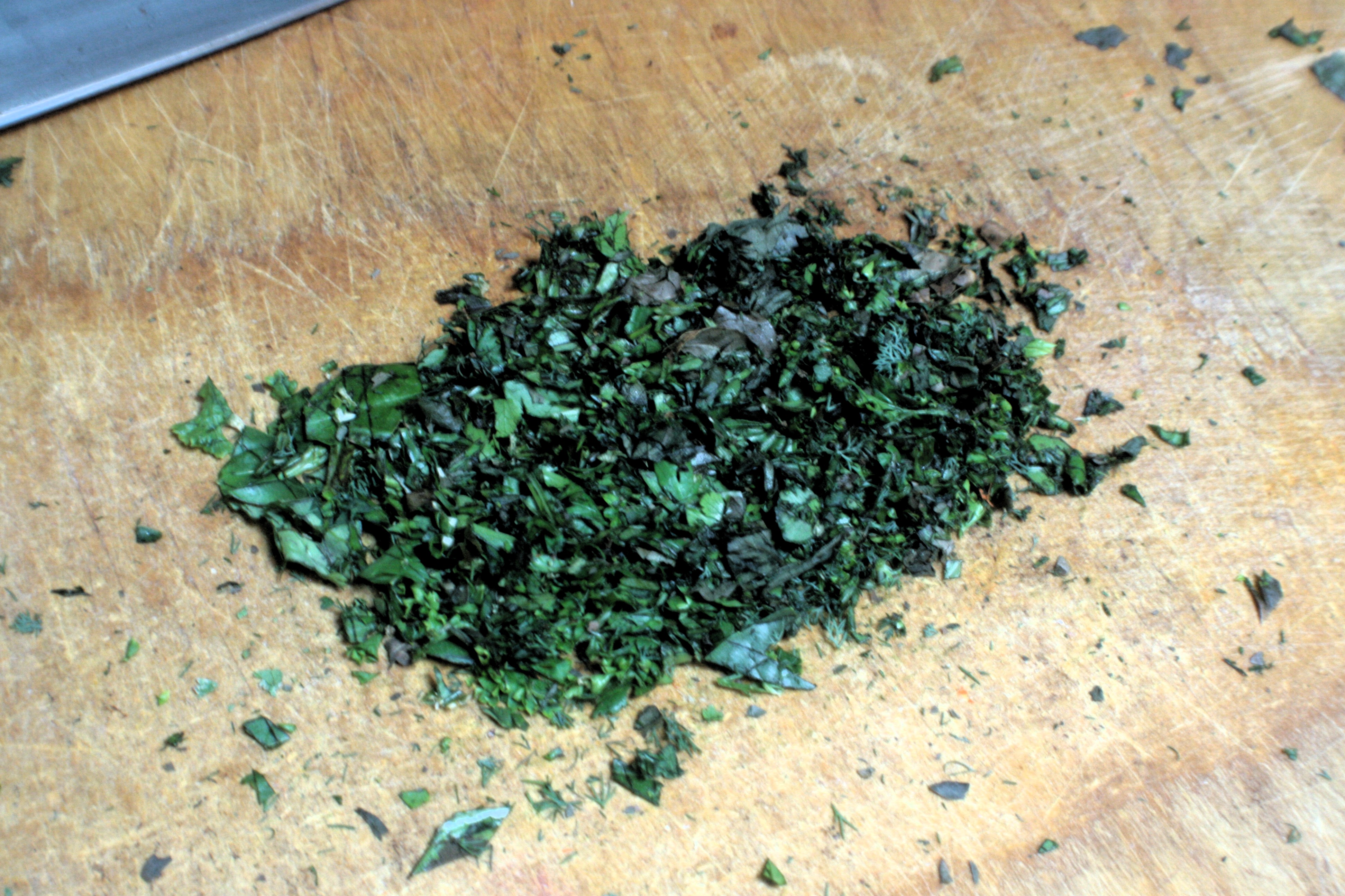 I chopped these up pretty thoroughly since I wanted to be able to spread them throughout the bread and get an even distribution. When I’m just rolling the herbs into a regular loaf, I don’t bother.