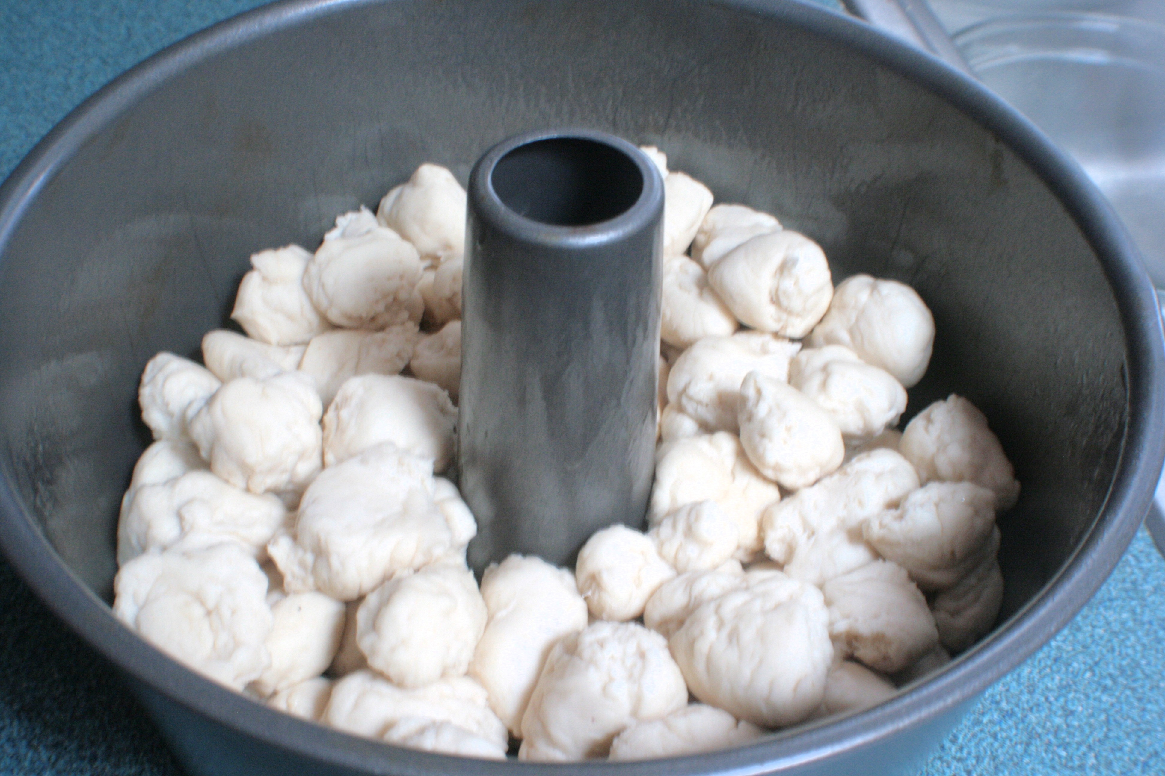 I started breaking away from the standard recipe after the first rise was complete. Instead of rolling out the dough, then shaping it into a loaf, I tore it into little balls. The traditional monkey break recipe starts with canned biscuit dough and this step, so if you’re not a bread-from-scratch creature, that’s ok. This is monkey bread – nobody is going to judge you for style.