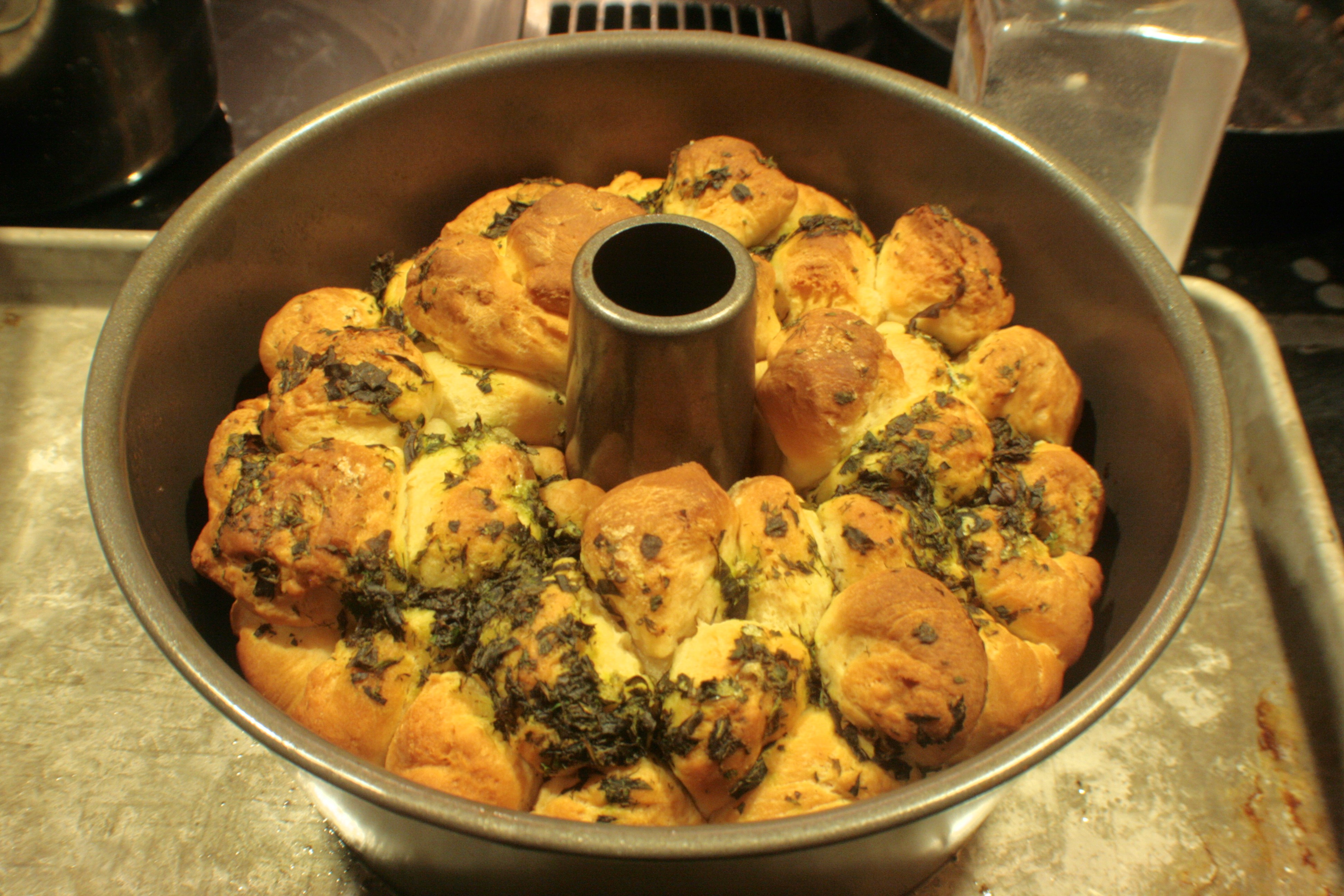 The trickiest part, honestly, is just arranging the dough into the bunt pan. I strongly recommend putting a baking sheet under the pan before you do this, then drizzling the butter and sprinkling the herbs as you layer. I did none of these things, so believe me when I assure you that you don’t want to follow in my footsteps on this particular front.