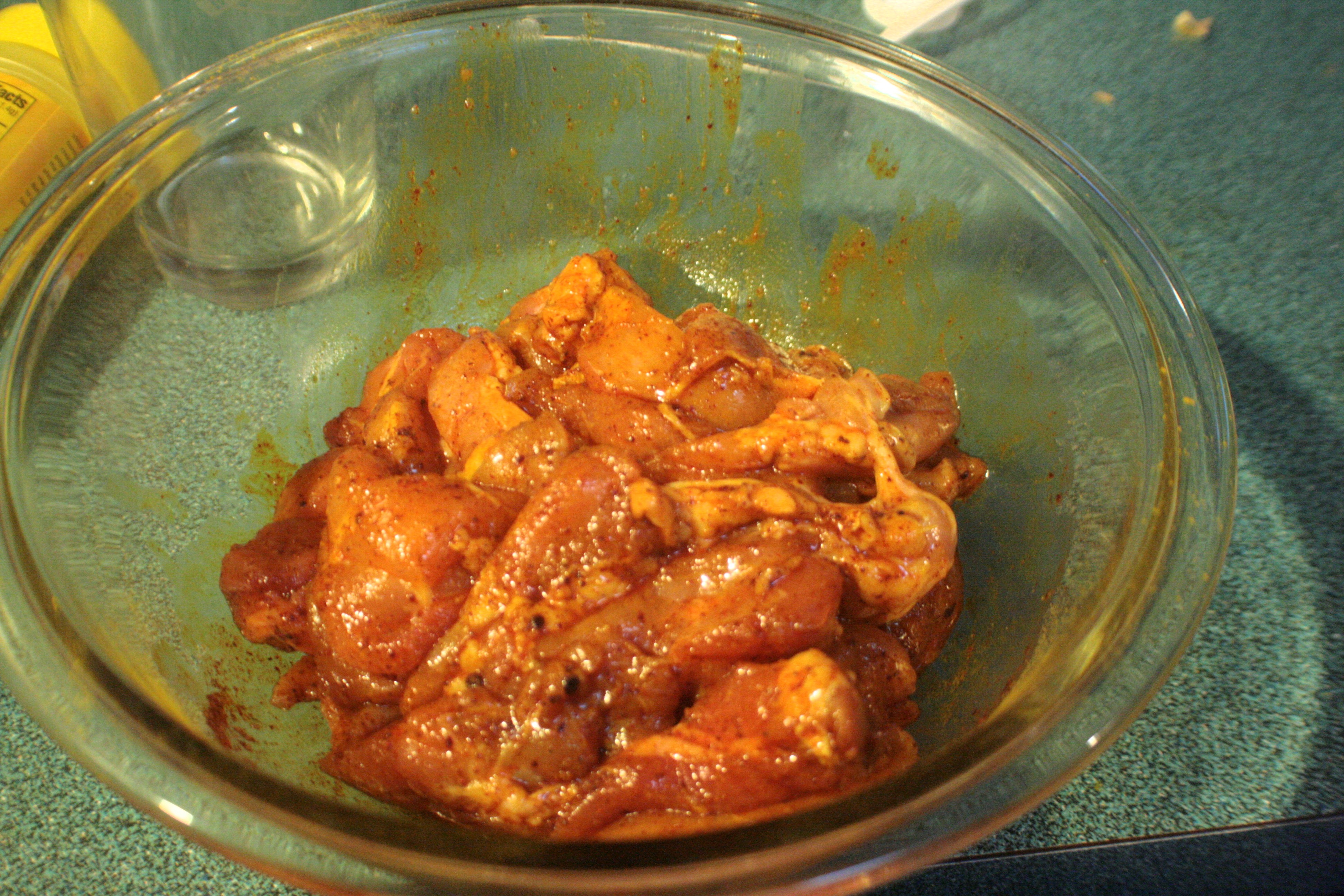 I used some yellow curry curry powder, olive oil, powdered sumac and a dash of salt in the marinade. Then I dropped the chicken in to soak it up while the onions cooked. Ideally I’d have done this the day before, but twenty minutes is enough to do something if that’s all you’ve got, and I was hungry.